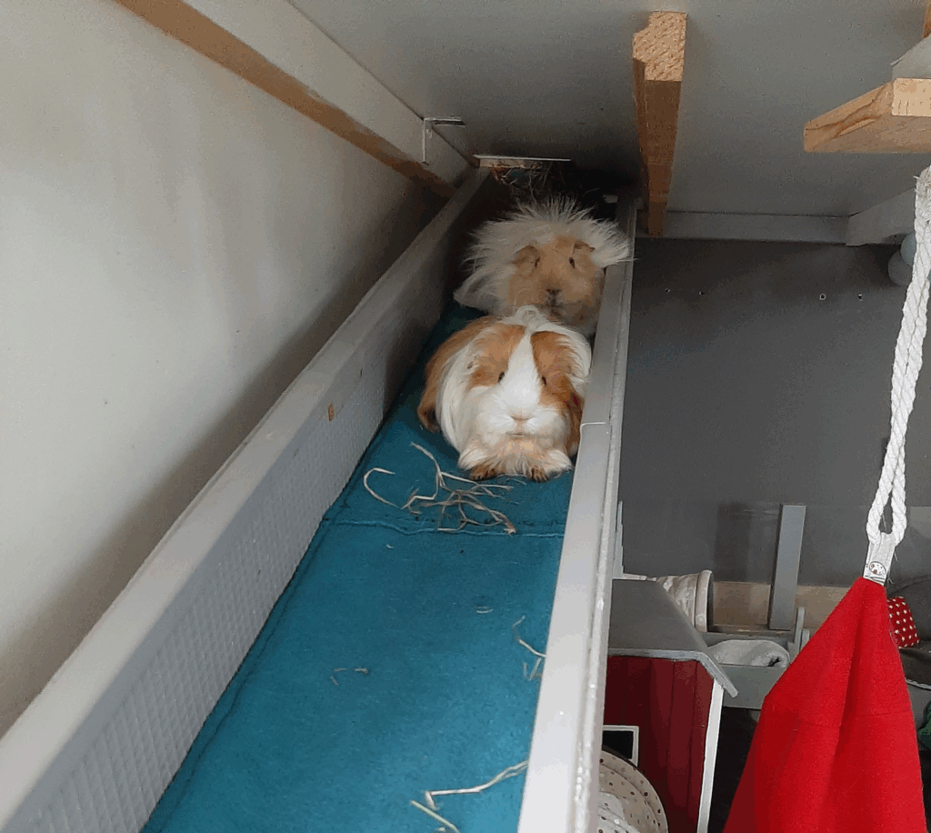 Eine flache Rampe verbindet die beiden Ebenen – so kann ich jederzeit bequem hoch oder runter laufen, ohne zu stolpern. (Und ja, ich bin stolz darauf, wie elegant ich das mache.) Die Rampe ist auch mit einer weichen urindichten Fleeceauflage ausgelegt und ermöglicht auch älteren Schweinchen den problemlosen Wechsel von einer zur anderen Ebene. Aber ihr werdet es nicht glauben: Wir nutzen diese Rampe nicht nur zum hin und her laufen, sondern auch zum ausgiebigen Gruppenchillen, wie ihr auf den Beweisfotos sehen könnt.