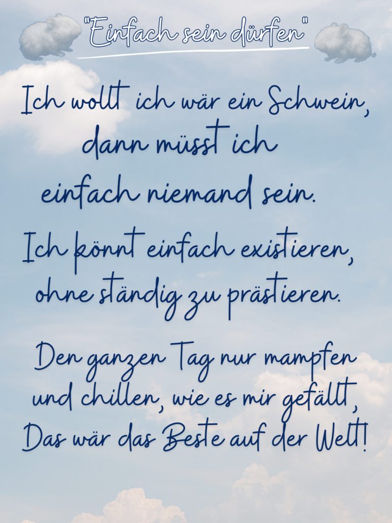 Manchmal treffen uns gerade die einfachen Worte mitten ins Herz. Dieses Gedicht ist für alle Meerli-Menschen, die beim Blick auf ihre Schweinchen spüren, wie wohltuend es wäre, einfach nur sein zu dürfen – ohne Druck, ohne Müssen, ohne ständiges Funktionieren. Meerschweinchen kennen keinen Leistungsplan. Sie leben, ruhen, futtern, kuscheln und zeigen uns damit eine stille Wahrheit, die wir Menschen viel zu oft vergessen.