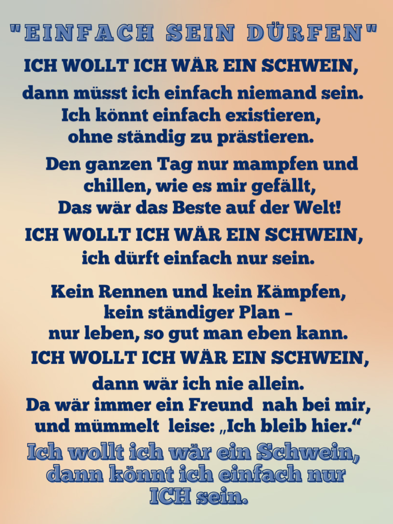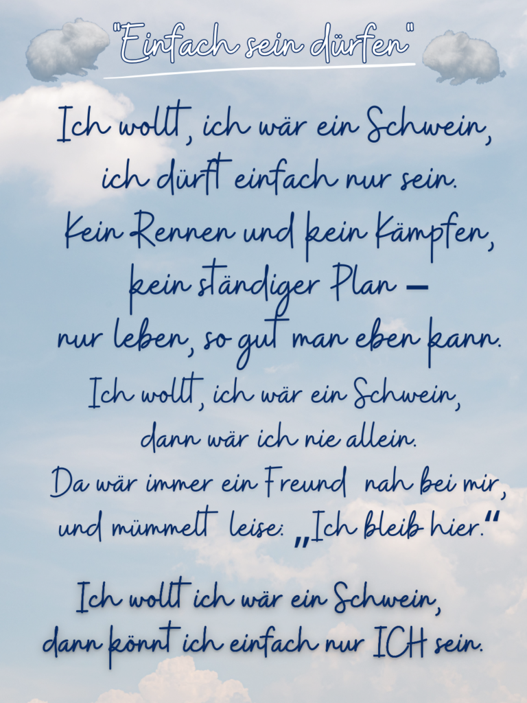 „Einfach sein dürfen“ ist deshalb mehr als nur ein süßes Schweinchen-Gedicht. Es ist eine kleine Erinnerung daran, dass der Wert eines Lebens nicht davon abhängt, wie viel man leistet. Vielleicht möchtest du dir diese Zeilen downloaden, ausdrucken und dort aufhängen, wo du sie immer wieder sehen kannst – als sanfte Erlaubnis an dich selbst, ein bisschen mehr Meerli und ein bisschen weniger Druck zu leben.
