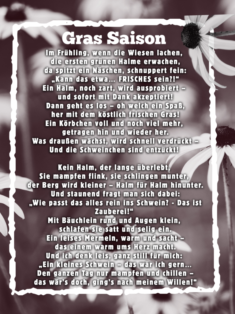 Für Meerschweinchen-Fans gibt es kaum einen schöneren Frühlingsmoment als den Beginn der Gras-Saison. Sobald die ersten frischen Halme sprießen, beginnt dieses ganz besondere Leuchten: kleine Näschen schnuppern neugierig, die Äuglein werden wach, und plötzlich scheint die Welt nur noch aus Genuss, Wiese und Glück zu bestehen. Genau dieses Gefühl fängt das Gedicht ein – die Vorfreude, das Schlemmen und diese stille, satte Zufriedenheit danach.