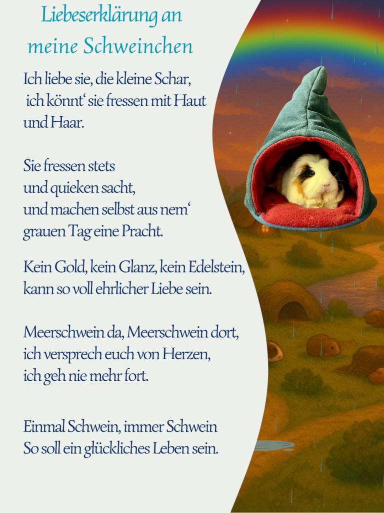 Es gibt diese Liebe, die man kaum vernünftig erklären kann – und genau das macht sie so echt. Wer Meerschweinchen ins Herz geschlossen hat, kennt dieses Gefühl: Man schaut sie an und denkt, wie kann so viel Zartheit, Unsinn, Wärme und Trost bitte in so einem kleinen Wesen wohnen? Dieses Gedicht ist eine liebevolle Hommage an genau diese tiefe, oft ganz stille Verbindung zwischen Mensch und Schweinchen.