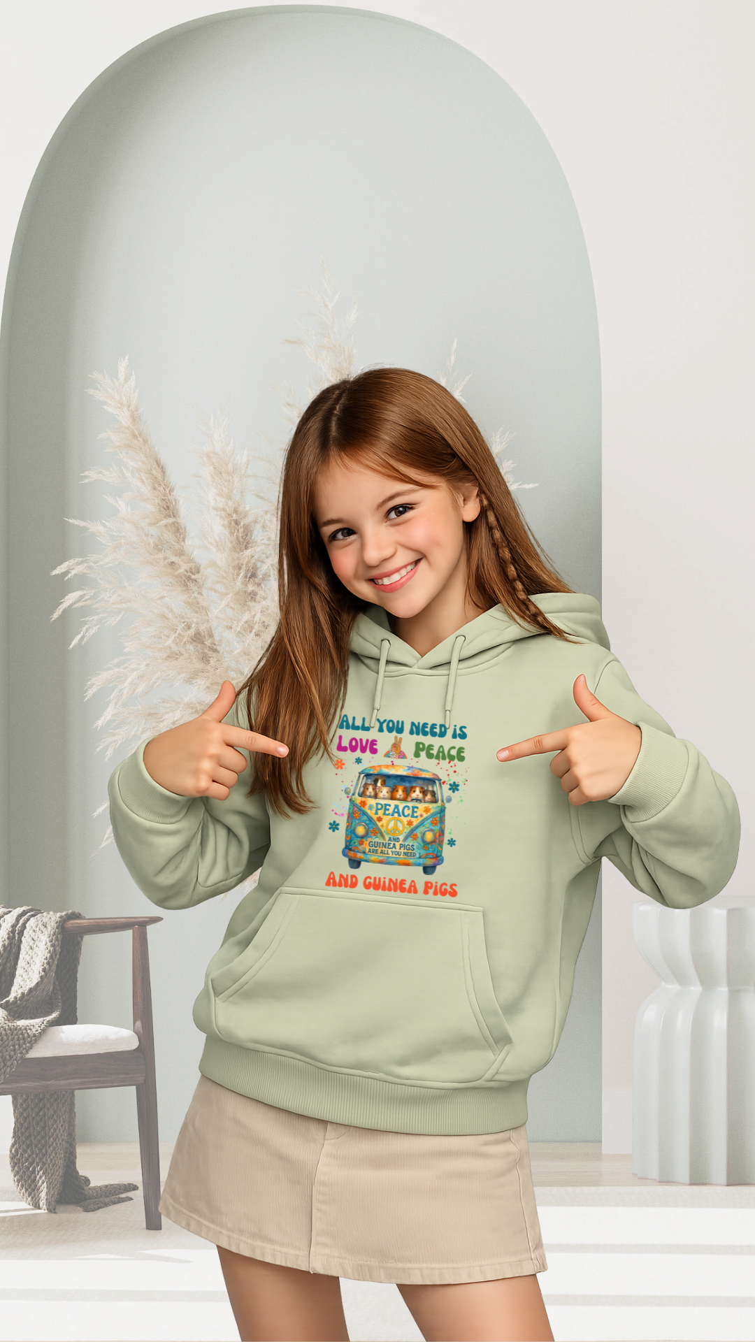Der Damen Hoodie mit dem Meerschweinchen Motiv „All You Need Is Love, Peace and Guinea Pigs“ ist ein gemütliches Lieblingsstück für alle, die farbenfrohe, fröhliche und liebevoll gestaltete Motive mögen. Der Peace-Bus mit den süßen Meerschweinchen bringt eine warme, lockere und kreative Ausstrahlung auf den Hoodie und macht ihn zu einem besonderen Begleiter im Alltag.