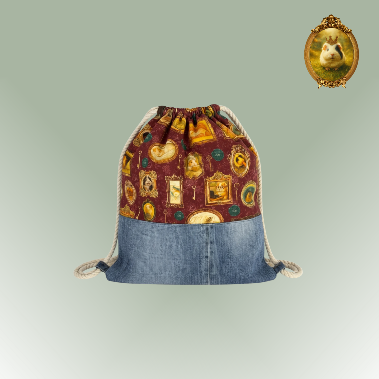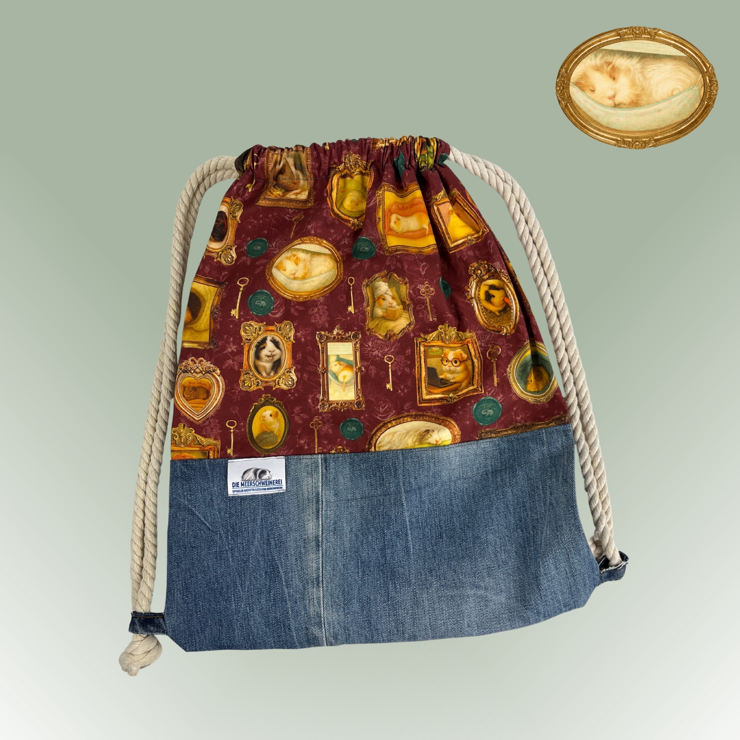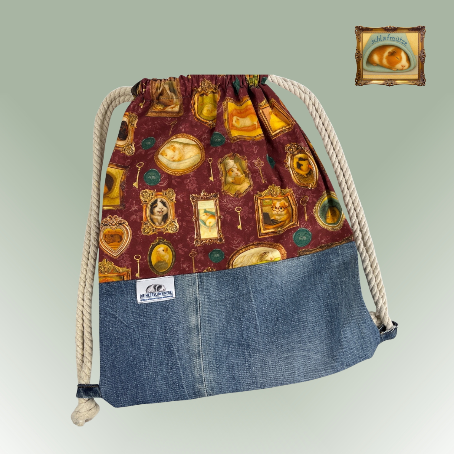 Das Stoffdesign stammt aus meiner eigenen Designer-Canvasstoff Kollektion, die ich als Meerschweinchen-Liebhaberin mit viel Herz und Liebe zum Detail entworfen habe. Das Motiv „Pippas Wohnzimmer“ erinnert an eine gemütliche Vintage-Galerie voller Meerschweinchenporträts.