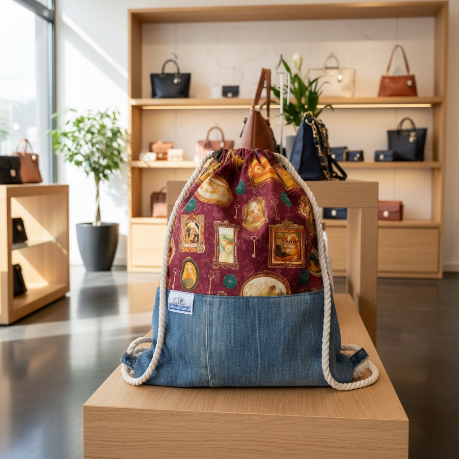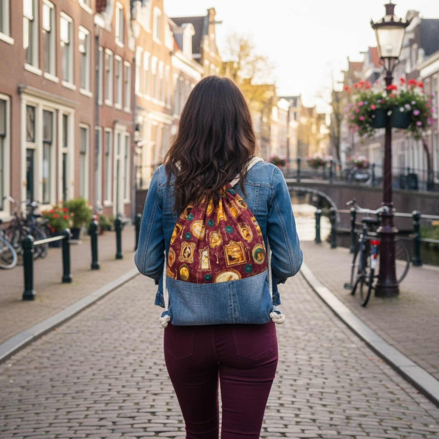 Erwachsenen Rucksack „Pippas Wohnzimmer“ – Weinrot mit Jeans