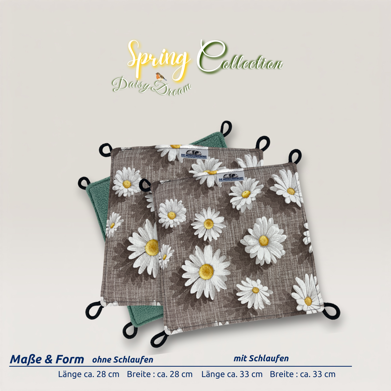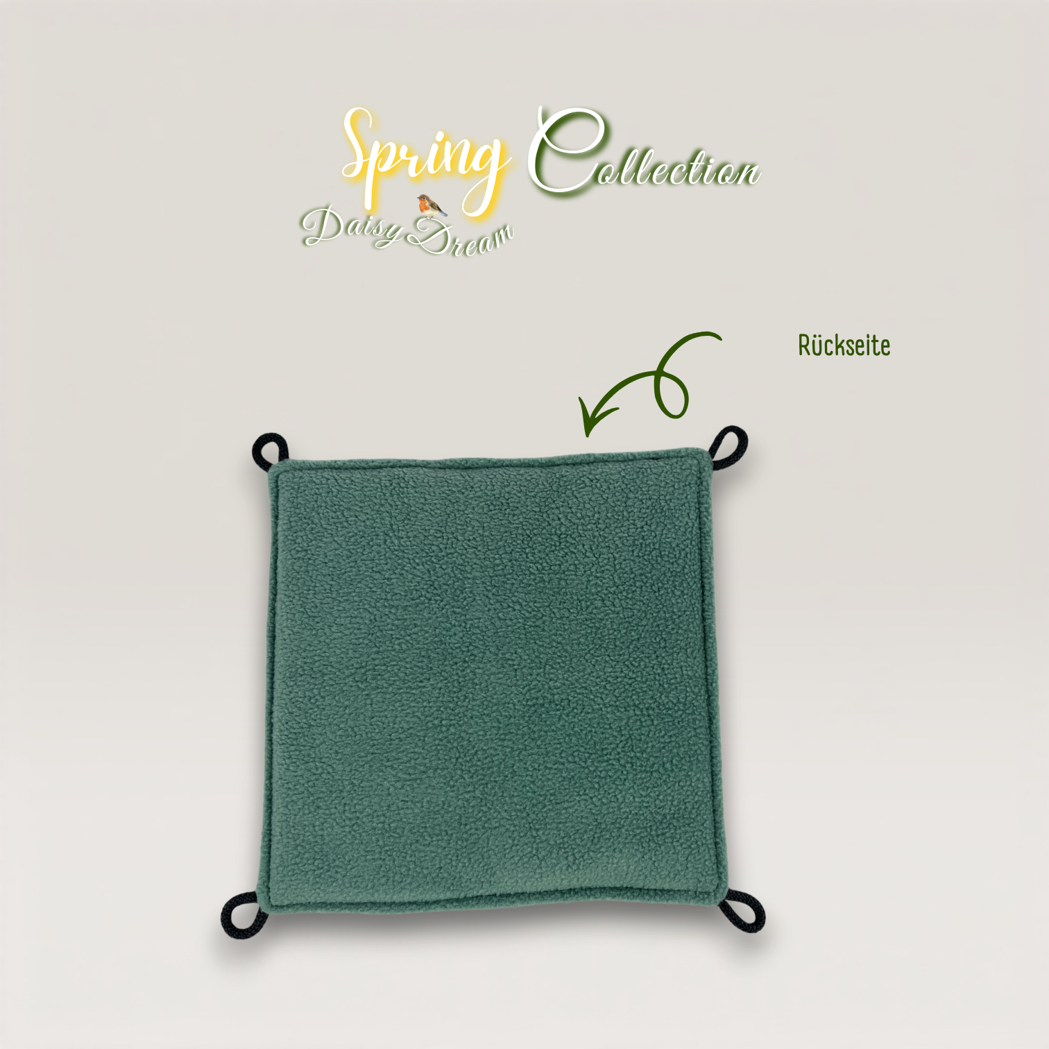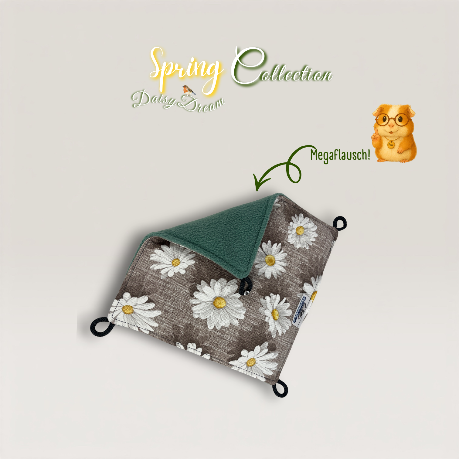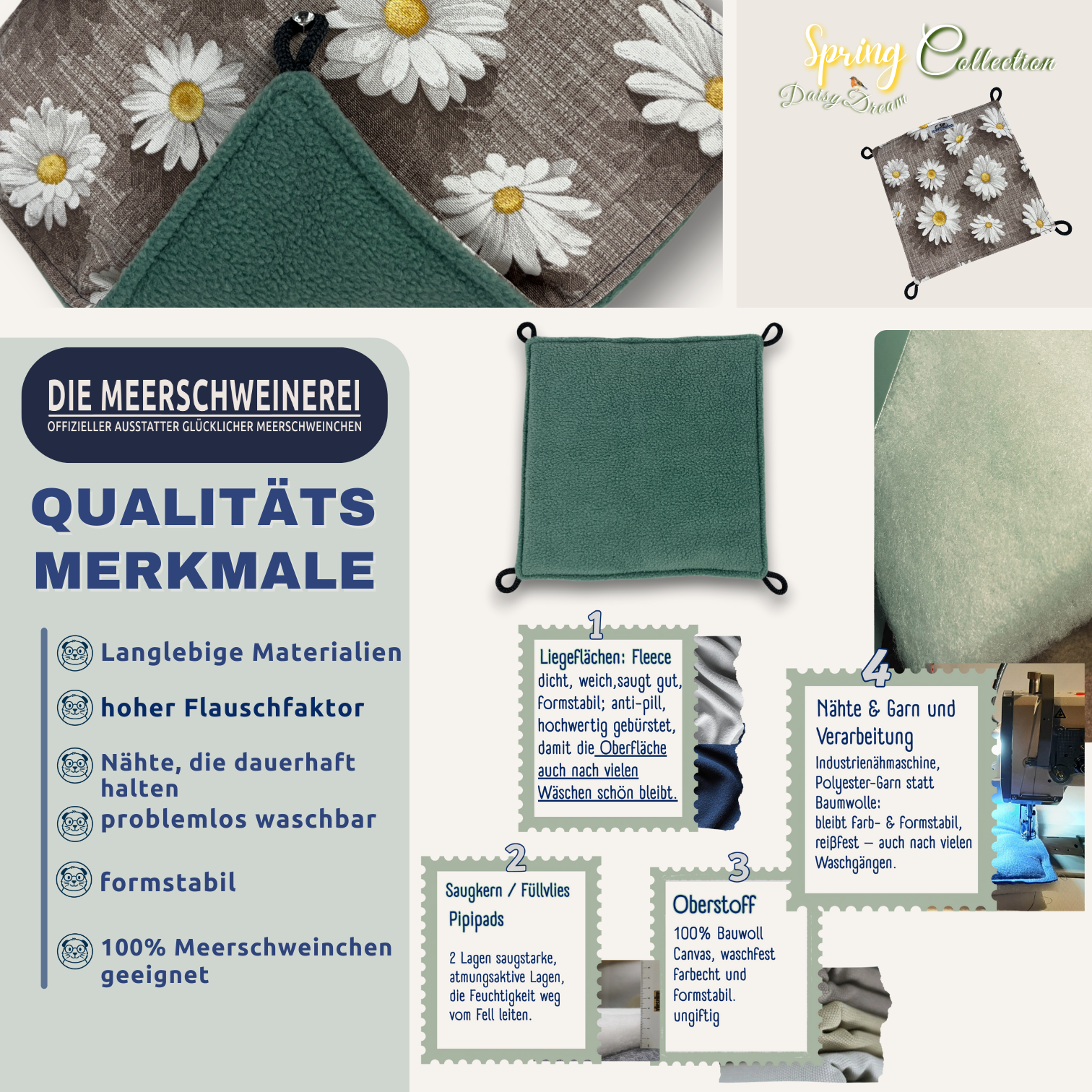 Diese Kuschel Hängematte stammt aus der Spring Daisy Dreams Collection. Das Design ist wie eine Frühlingswiese zum Anfassen. Die Margariten wirken wie frisch gepflückt. Weiße Blütenblätter, sonnengelbe Herzen – lebendig, aber nicht grell. Das Muster bringt Bewegung ins Gehege, ohne Unruhe zu schaffen. Es erinnert an eine ruhige Frühlingswiese, auf der sich kleine Pfötchen sicher und geborgen fühlen. Kombiniert ist dieser Stoff mit Anti Pill Fleece in der Farbe mintgrün.
