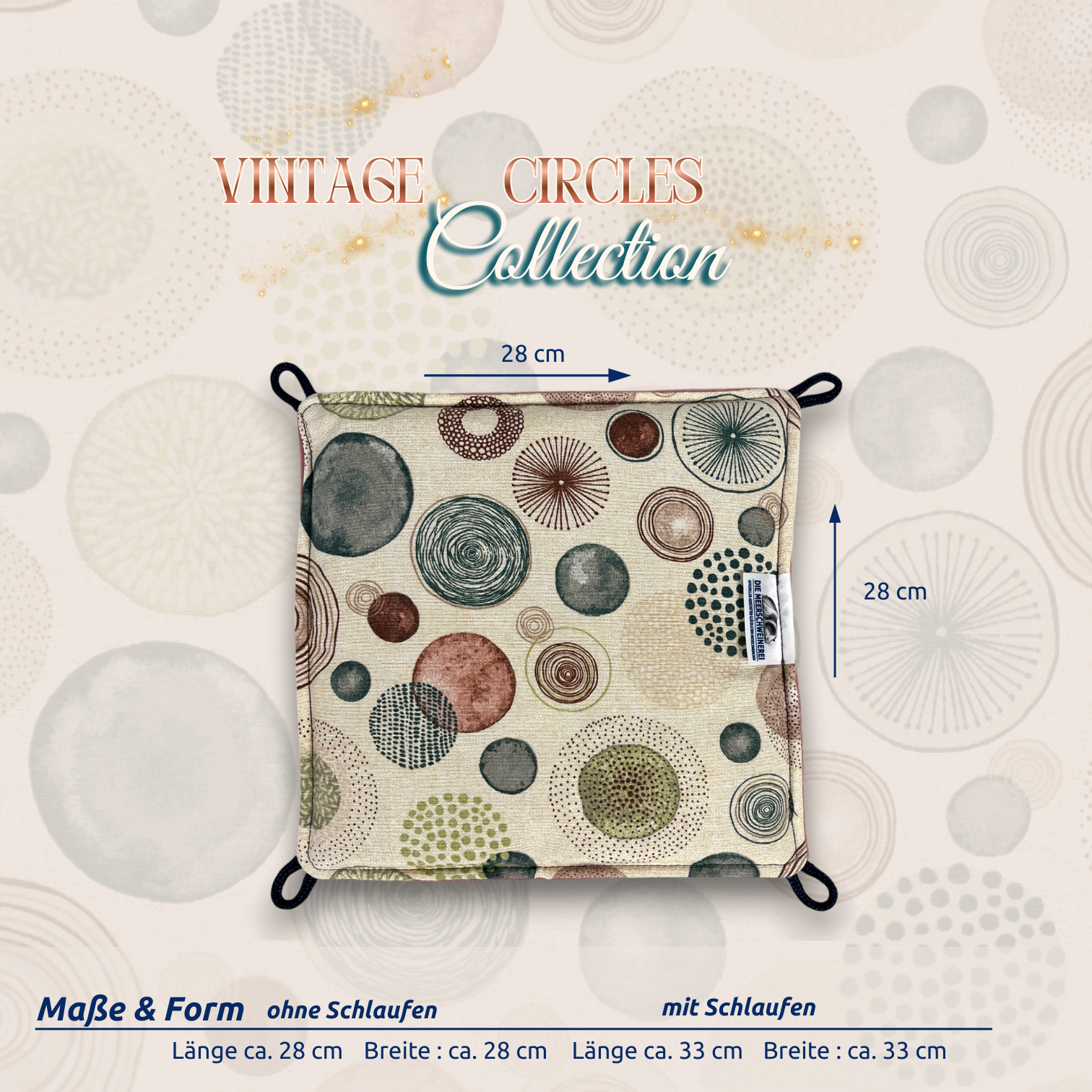 Der Unterstoff besteht aus hochwertigem, robustem Canvas im Vintage-Circles-Design. Die Polsterung besteht aus einem saugstarken Füllvlieskern für angenehmen Liegekomfort. Die Liegefläche ist mit flauschigem Anti-Pill-Fleece ausgestattet. Die stabilen Schlaufen sorgen für sicheren Halt.