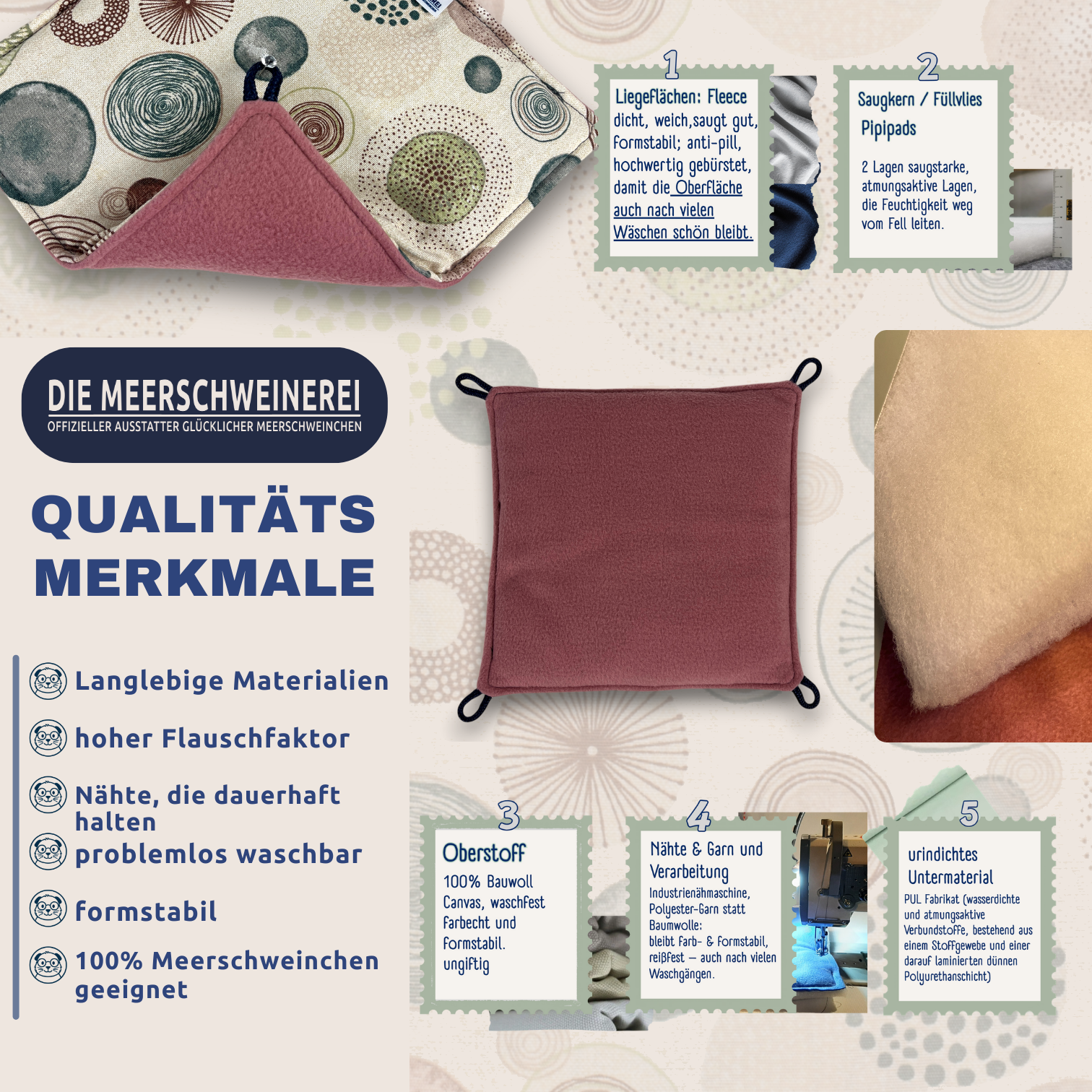 Diese Kuschel Hängematte stammt aus der Vintage Circles Collection. Das Design wirkt wie von Hand gezeichnete Kreise in sanften Naturtönen: Salbei, gedecktes Grün, warmes Beige, erdiges Braun und zarte Graunuancen. Die Muster erinnern an alte Drucktechniken, an Naturformen, an Baumringe und leise Wellen. Nichts ist laut – alles fließt. Diese Stoffe strahlen Ruhe aus und bringen eine harmonische, warme Atmosphäre ins Gehege. Kombiniert ist dieser Stoff mit Anti Pill Fleece in der Farbe altrosa.