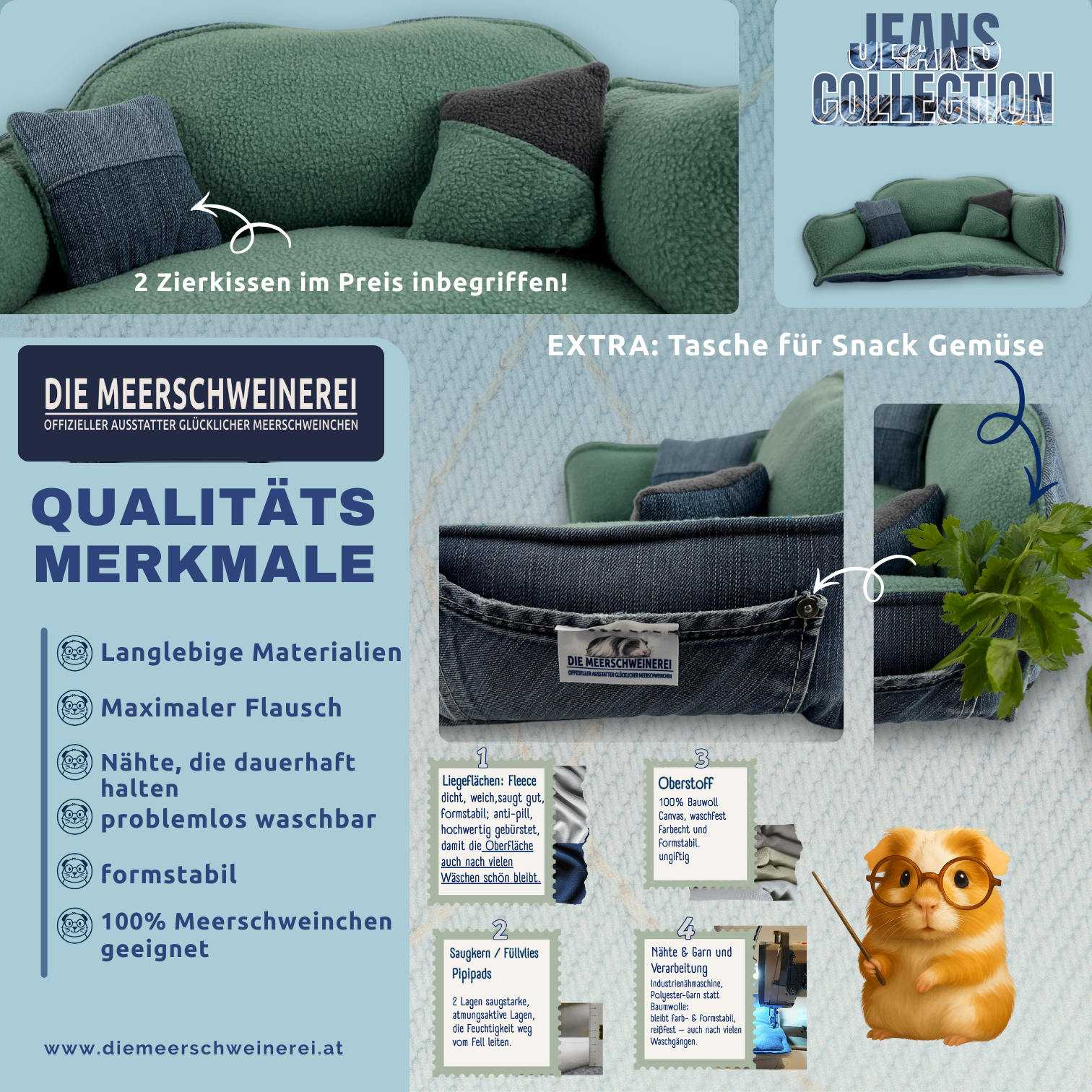 Die Jeans Collection steht für Individualität, Nachhaltigkeit und langlebige Qualität. Sie verbindet modernes Design mit funktionaler Gehegeeinrichtung und schafft stabile Rückzugsorte für Meerschweinchen, die täglich genutzt werden können.