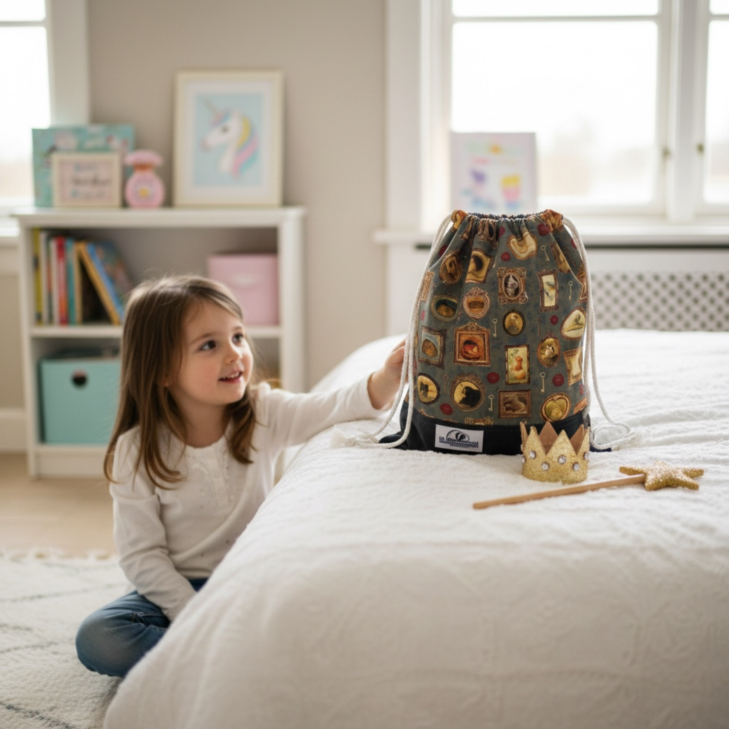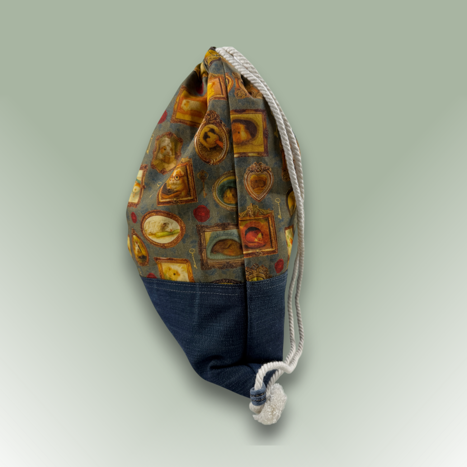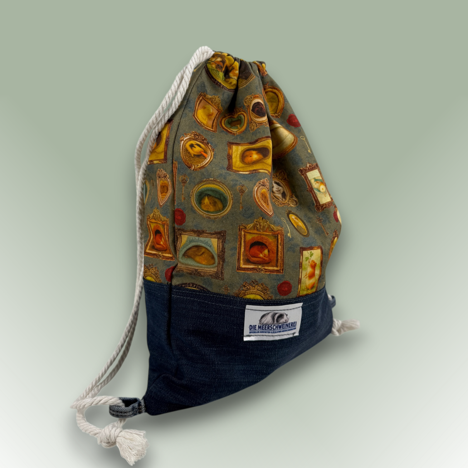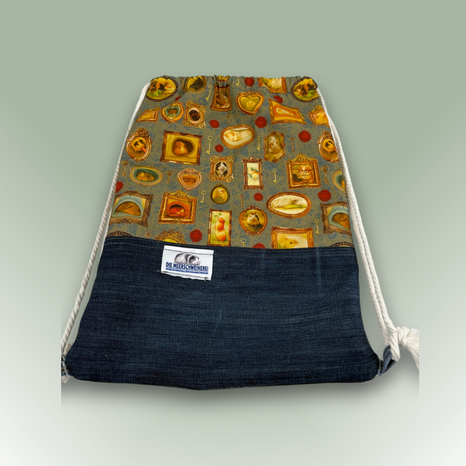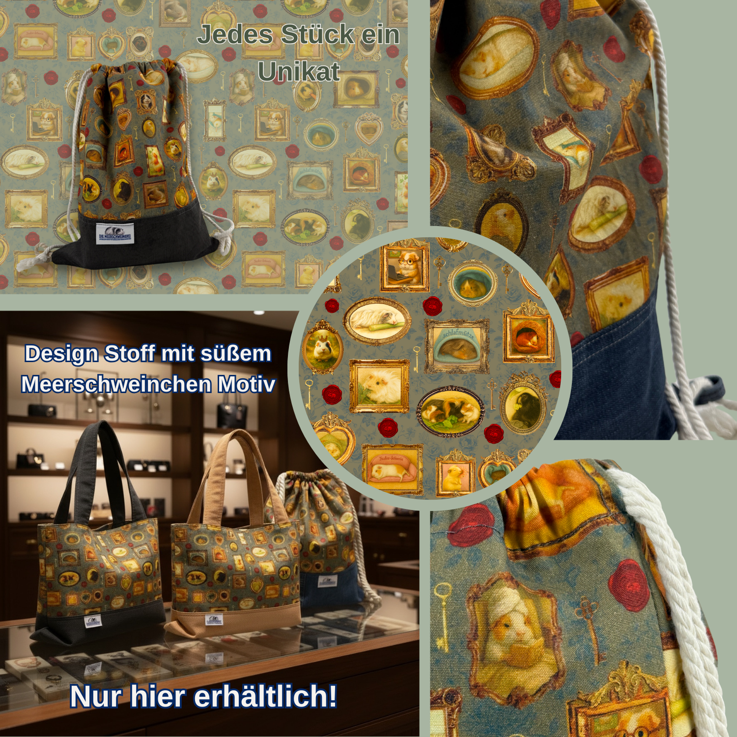 Das Stoffdesign stammt aus meiner eigenen Designer-Canvasstoff Kollektion, die ich als Meerschweinchen-Liebhaberin mit viel Herz und Liebe zum Detail entworfen habe. Das Motiv „Pippas Wohnzimmer“ erinnert an eine gemütliche Vintage-Galerie voller Meerschweinchenporträts.