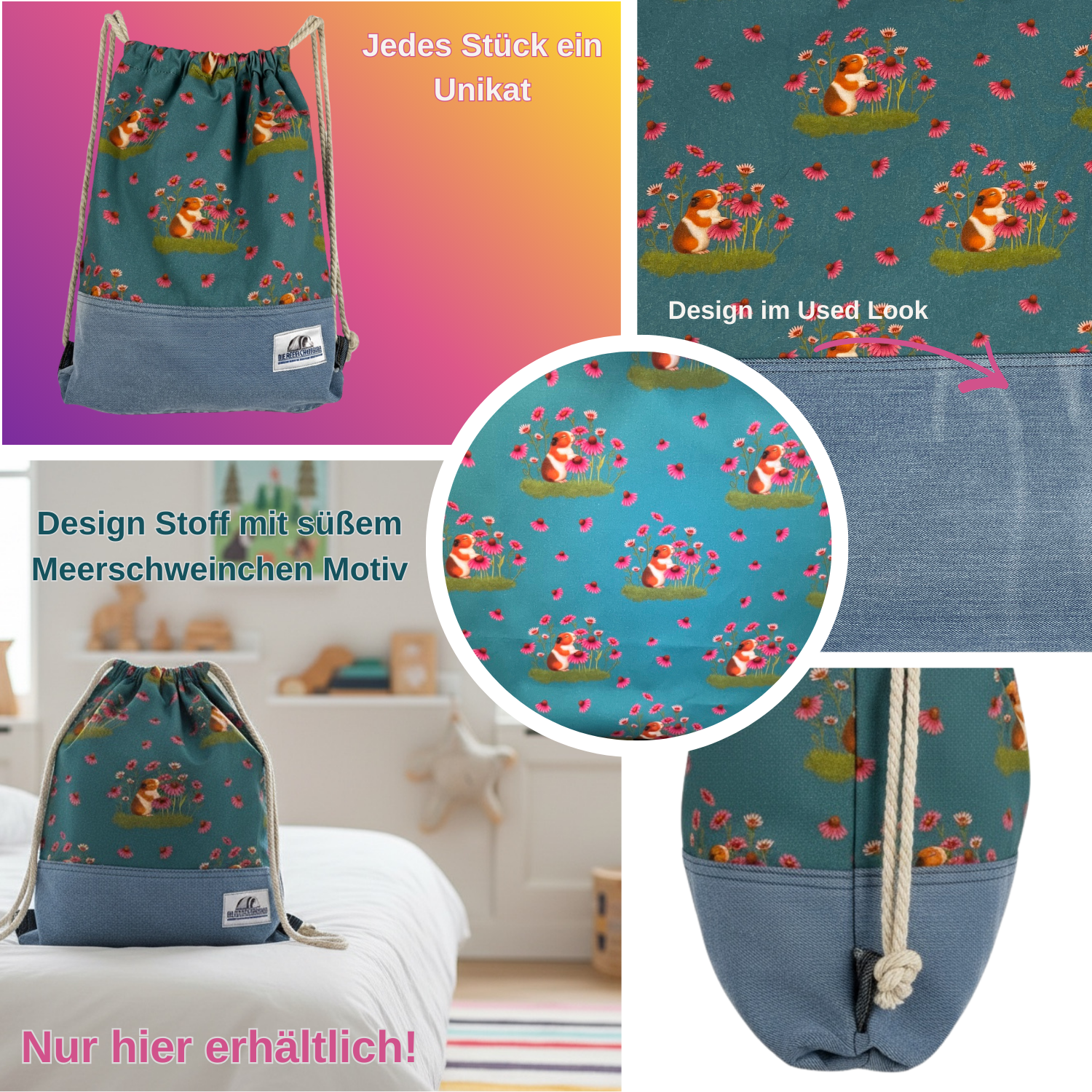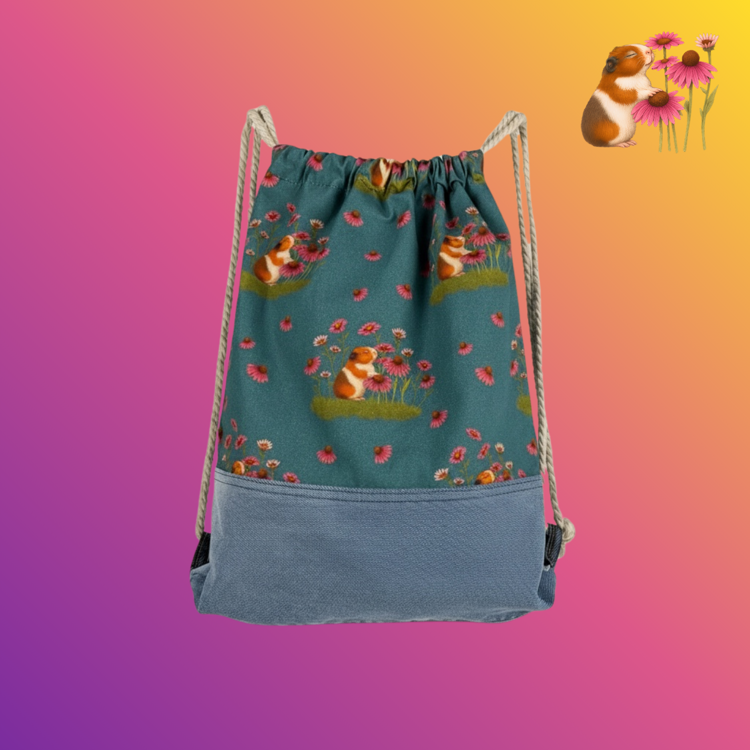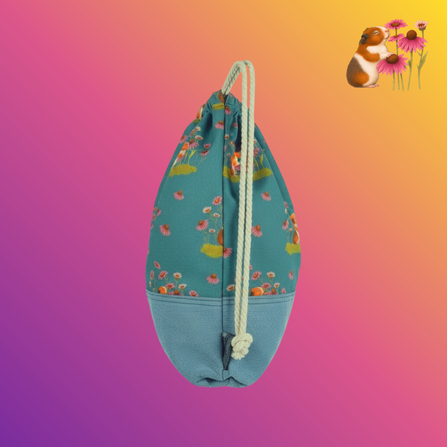 Das liebevolle Stoffdesign stammt aus meiner eigenen Designer-Canvasstoff Kollektion, die ich als Meerschweinchen-Liebhaberin mit ganz viel Herz entworfen habe. Auf einem frühlingsfrischen türkisen Hintergrund sitzt ein süßes Meerschweinchen zwischen zarten Sonnenhutblumen und genießt den Moment, während rundherum kleine Blütenblätter durch die Luft tanzen.