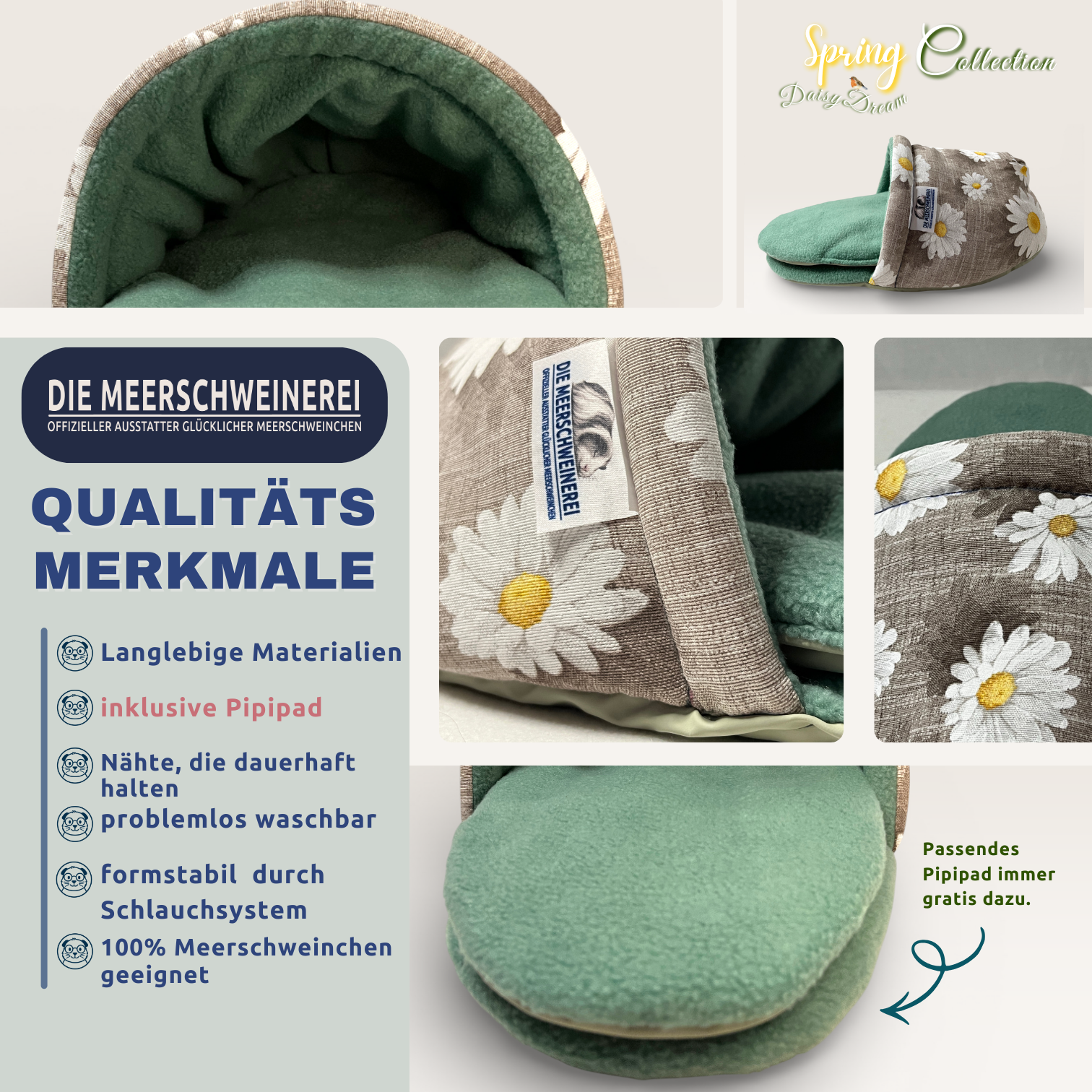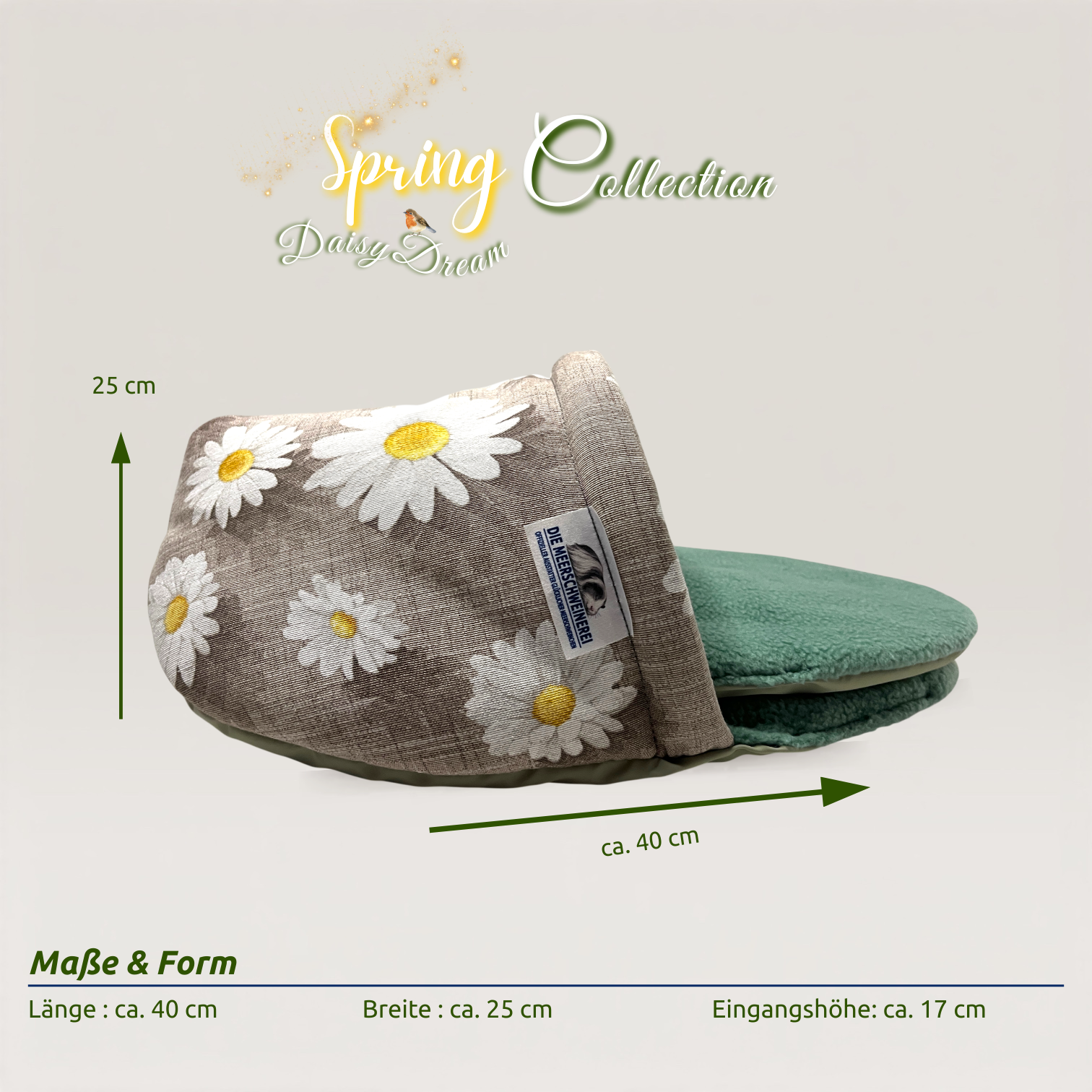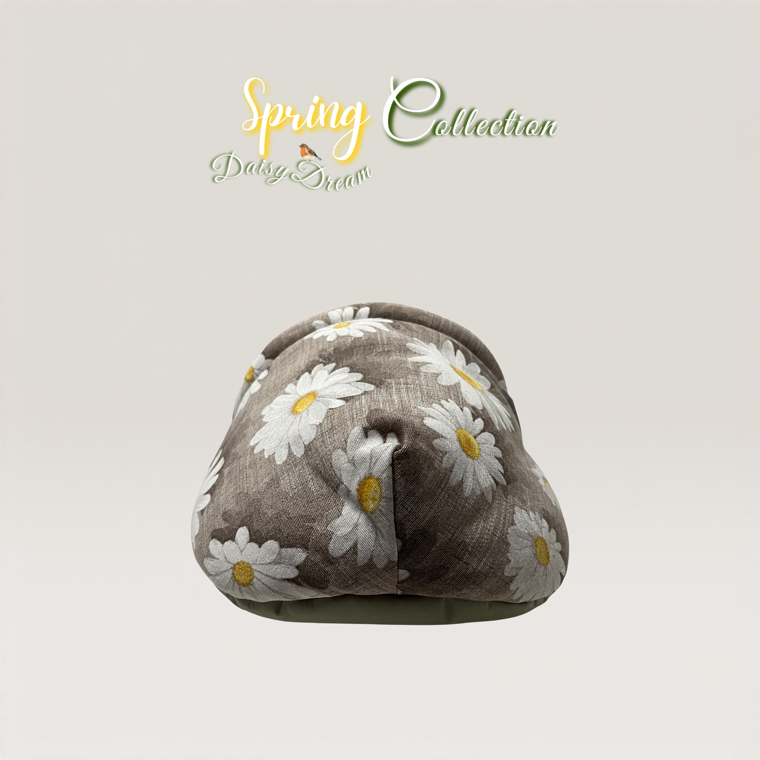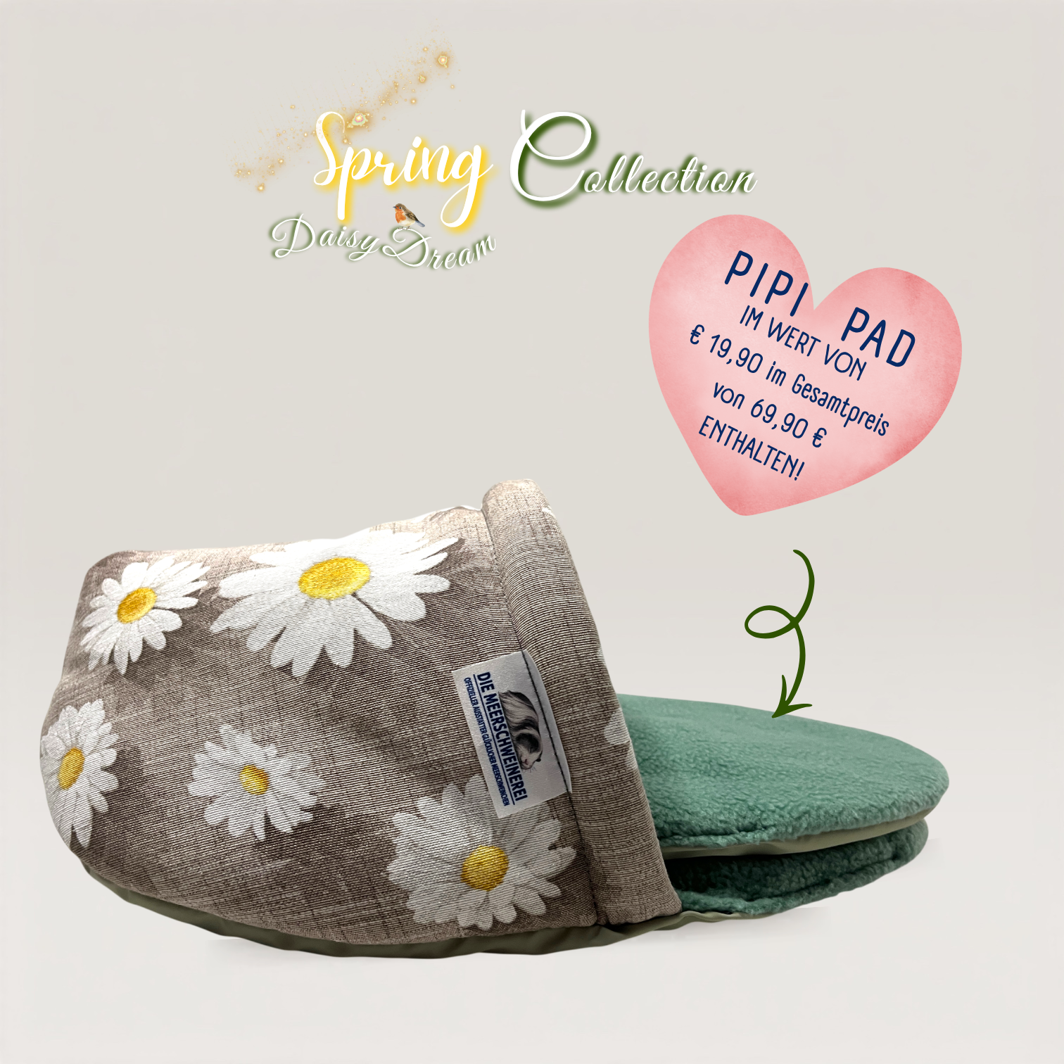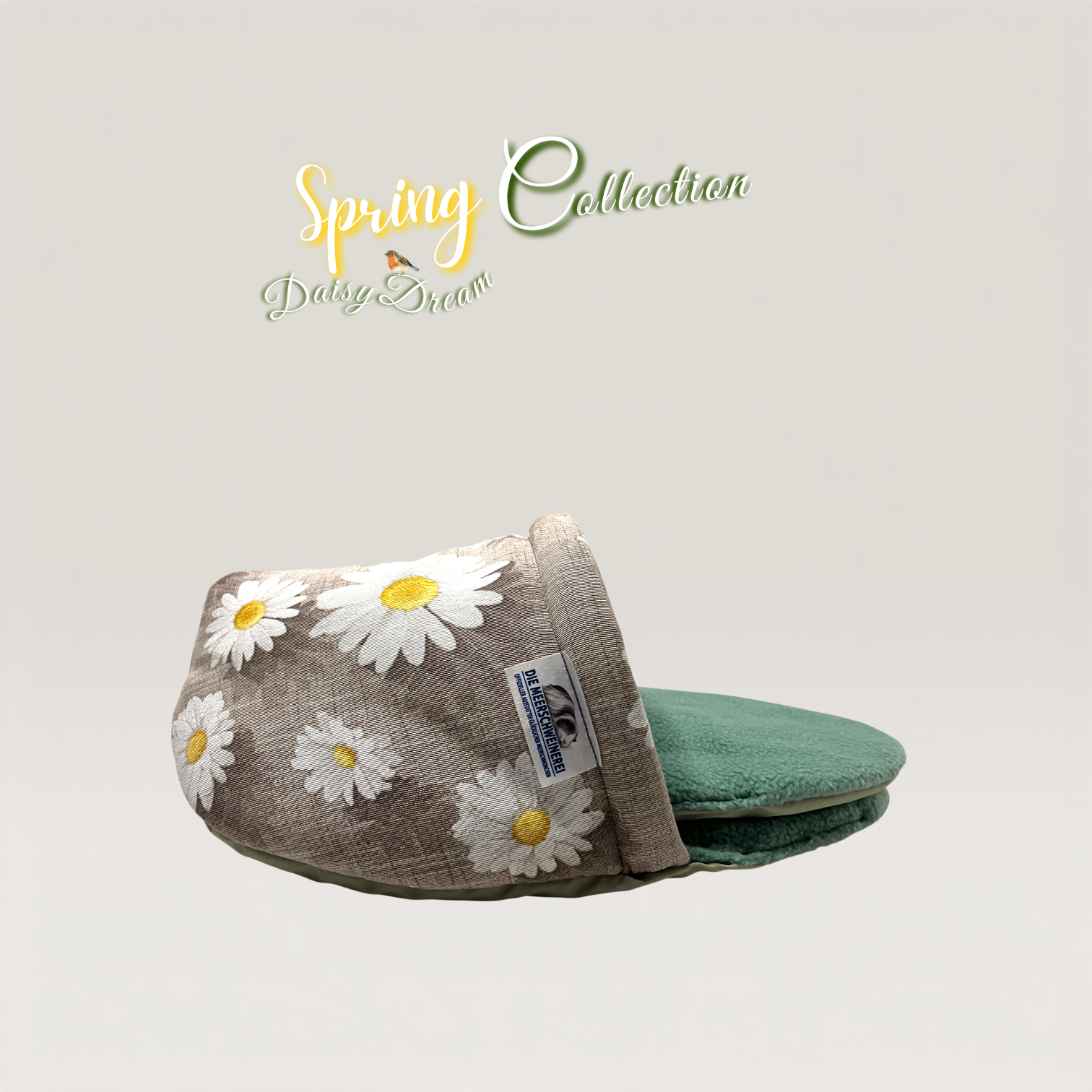 Dieser Kuschel Hausschuh stammt aus der Spring Daisy Dreams Collection. Das Design ist wie eine Frühlingswiese zum Anfassen. Die Margariten wirken wie frisch gepflückt. Weiße Blütenblätter, sonnengelbe Herzen – lebendig, aber nicht grell. Das Muster bringt Bewegung ins Gehege, ohne Unruhe zu schaffen. Es erinnert an eine ruhige Frühlingswiese, auf der sich kleine Pfötchen sicher und geborgen fühlen. Kombiniert ist dieser Stoff mit Anti Pill Fleece in der Farbe mintgrün.