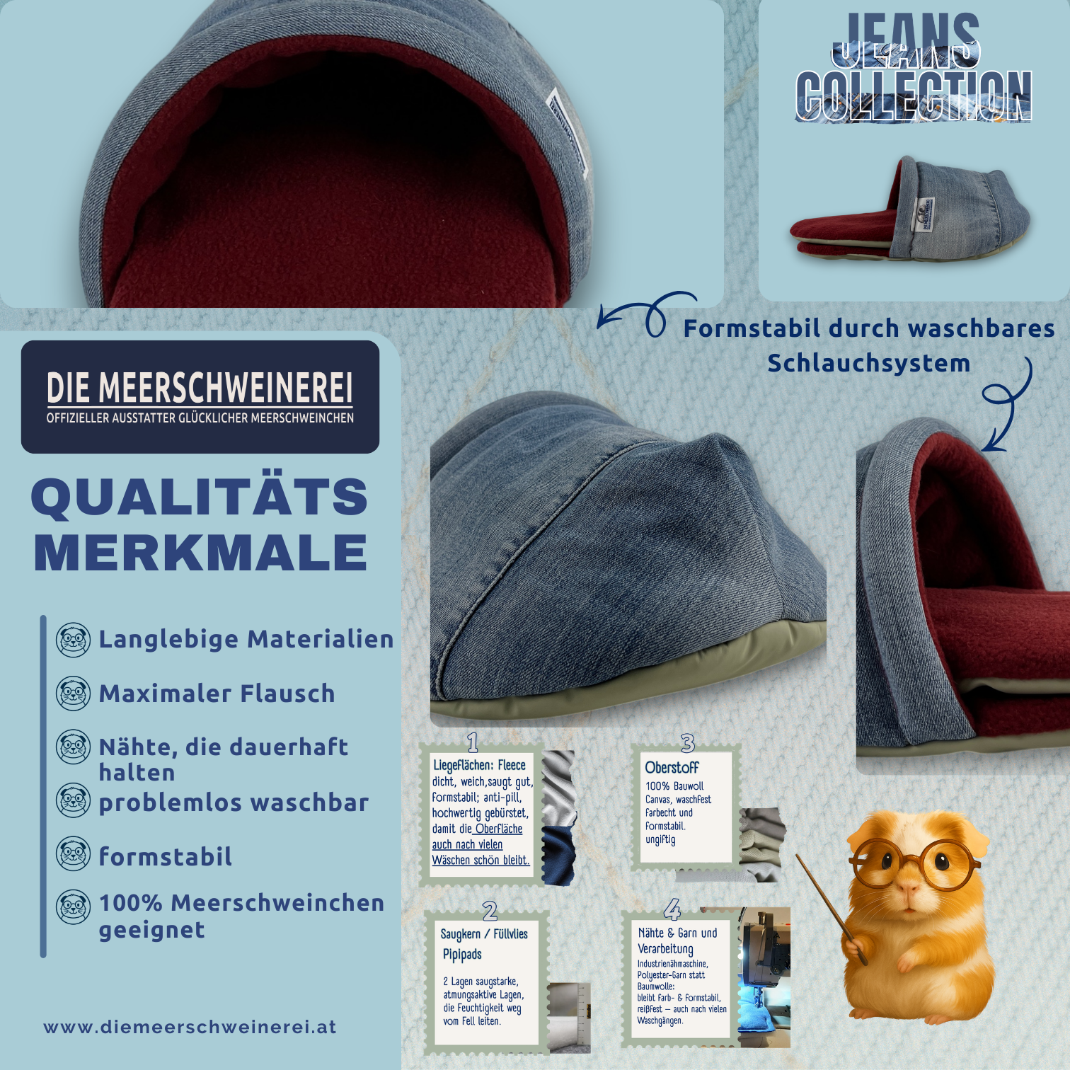 Die Jeans Collection steht für Individualität, Nachhaltigkeit und langlebige Qualität. Sie verbindet modernes Design mit funktionaler Gehegeeinrichtung und schafft stabile Rückzugsorte für Meerschweinchen, die täglich genutzt werden können.
