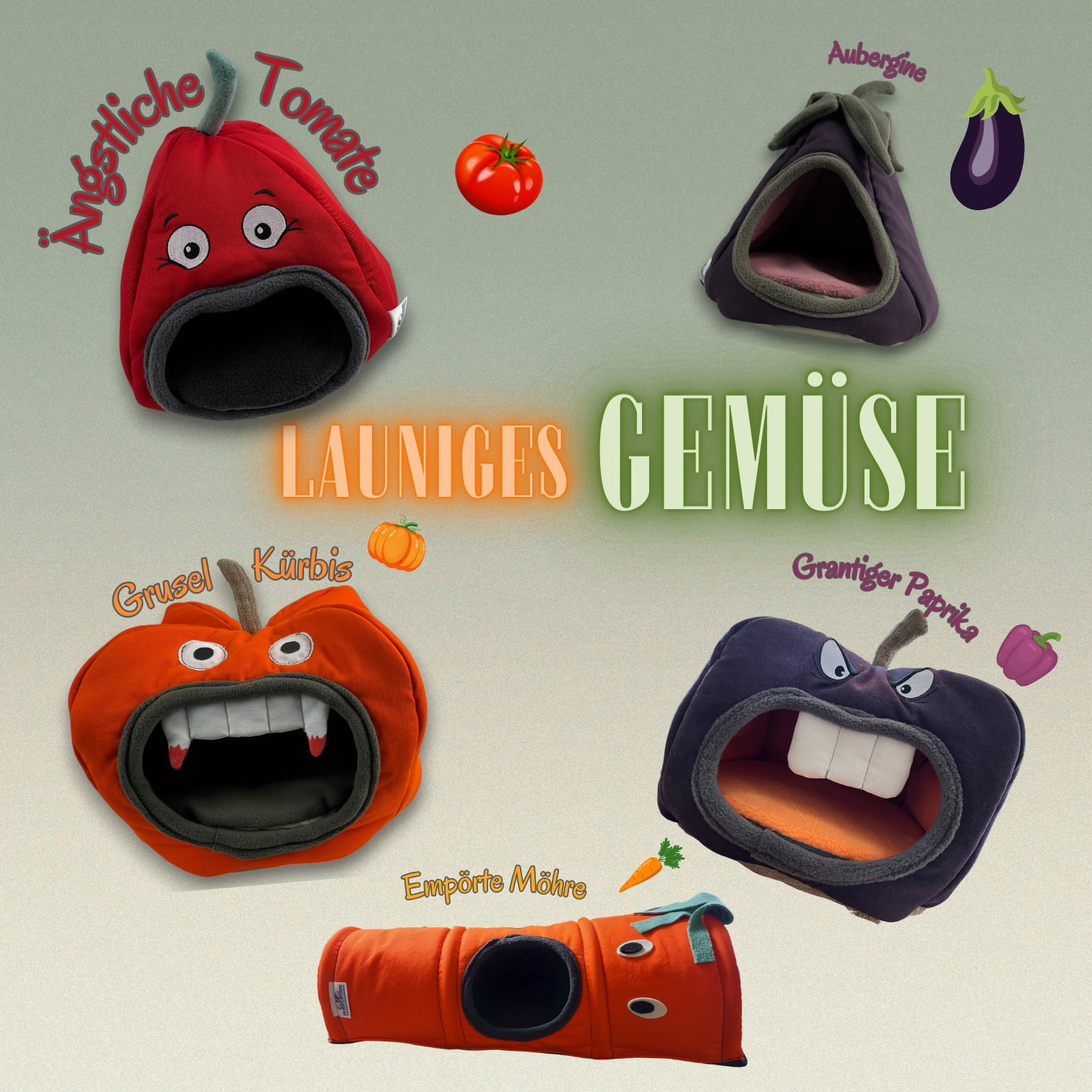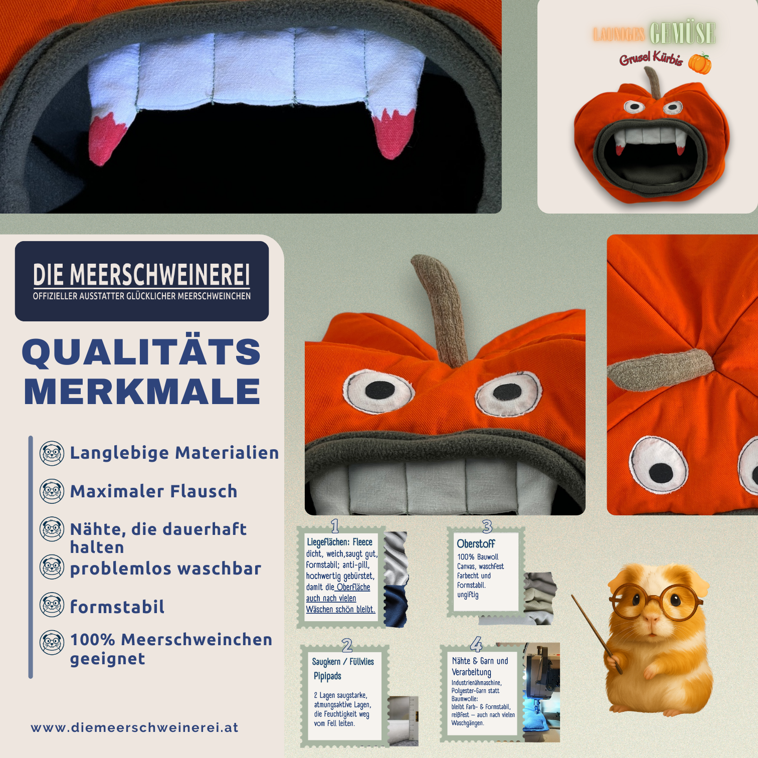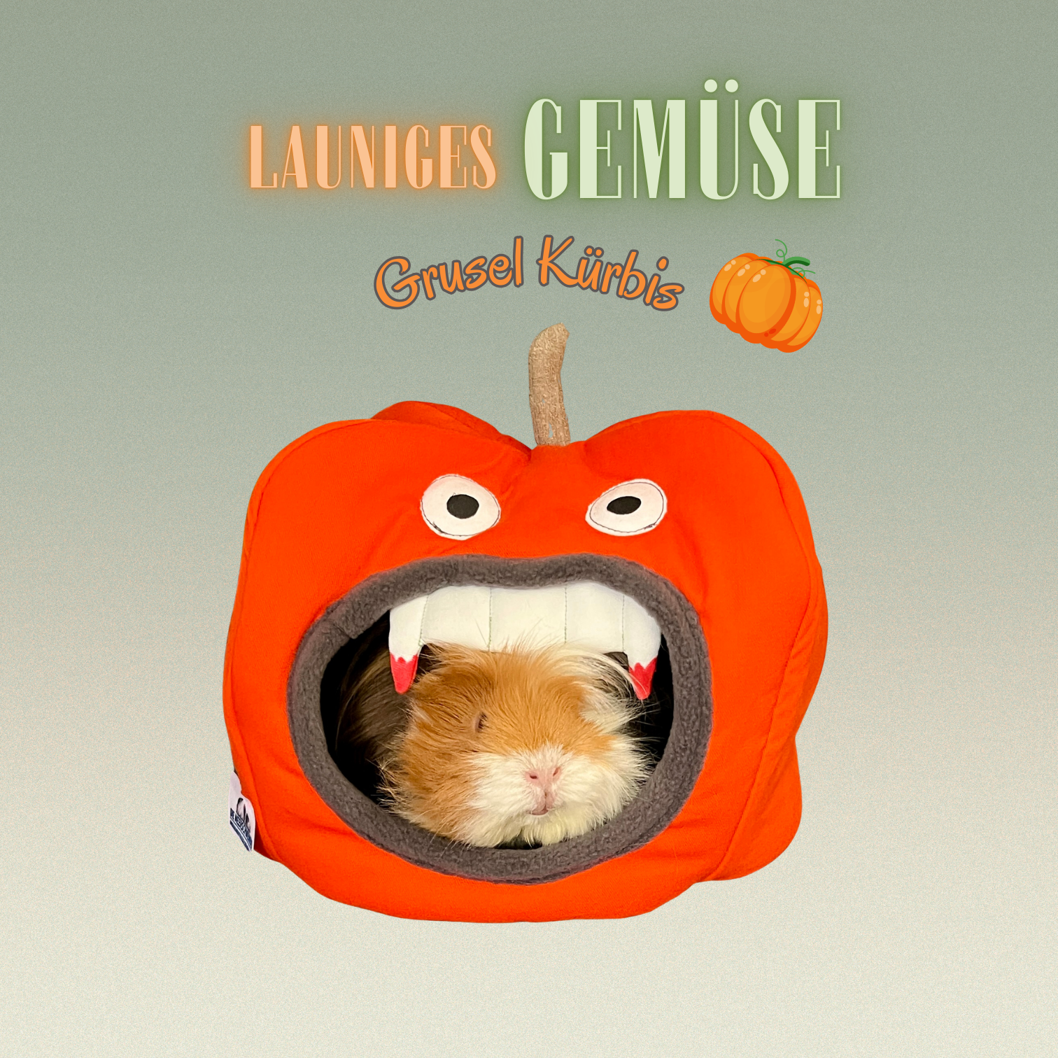 Die Meerschweinchen Kuschelhöhle Grusel Kürbis ist Teil der Kollektion „Launiges Gemüse“. Diese Kollektion verbindet charakterstarke Designs mit funktionalen Kuschelsachen für Meerschweinchen.
