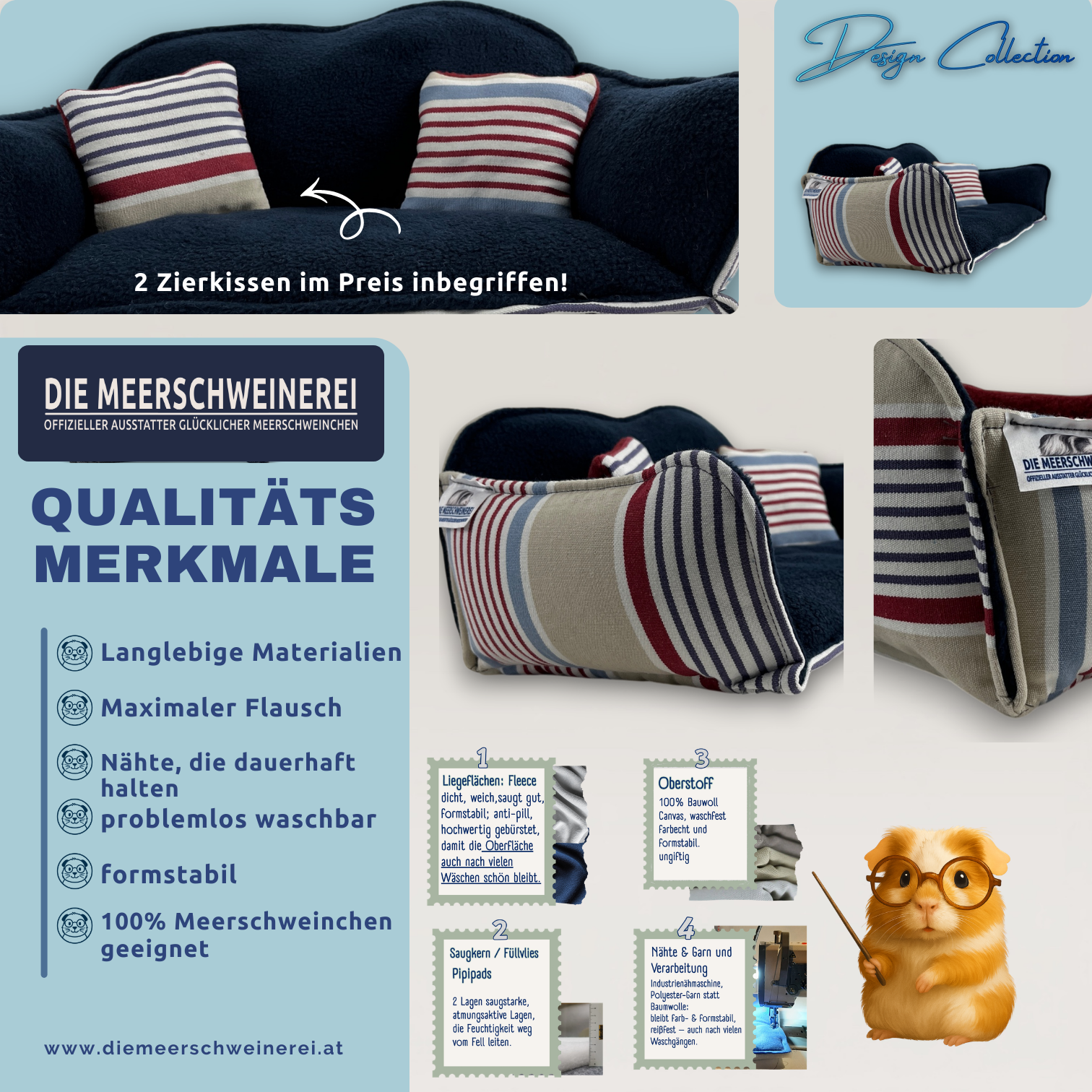 Jedes Meerschweinchen Kuschelsofa wird in Niederösterreich in sorgfältiger Handarbeit auf Industrienähmaschinen gefertigt. Vor der Aufnahme in die Design Collection wird jedes Stück auf Stabilität, Komfort und Alltagstauglichkeit geprüft.