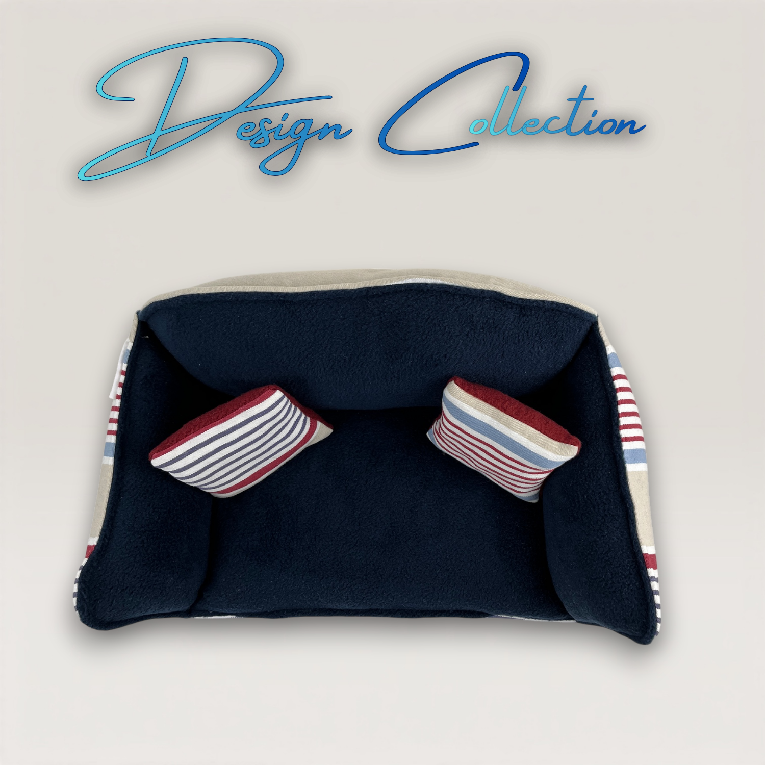 Im Inneren sorgt tiefdunkler, samtiger Anti-Pill-Fleece in Marineblau für weichen, saugfähigen Liegekomfort. Der dunkle Blauton unterstreicht den maritimen Charakter und bildet einen harmonischen Kontrast zum helleren Außenstoff. Zwei passende Dekokissen im Streifendesign greifen die Farben auf und verstärken die Strandkorb-Optik.