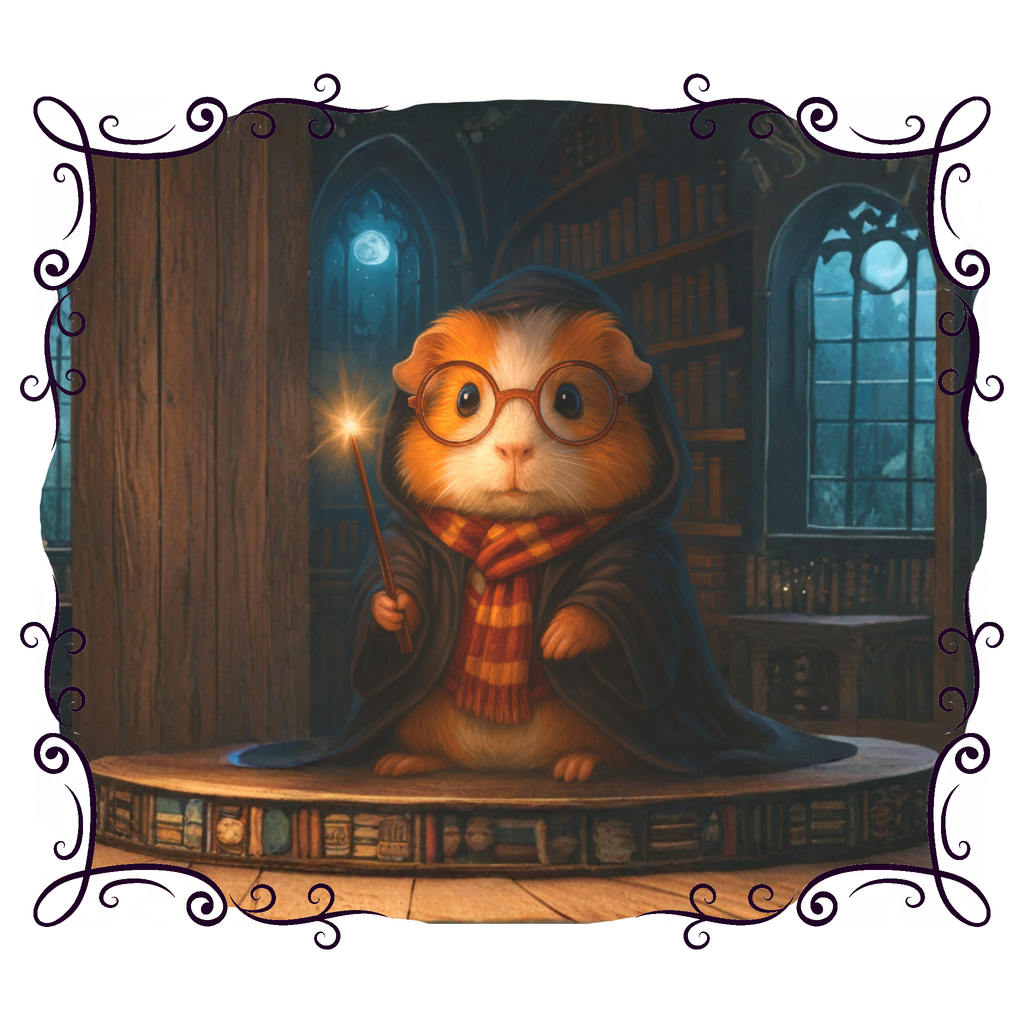 Pippa Magic  ist ein Motiv voller Zauber, Wärme und dieser ganz besonderen kleinen Meerschweinchen-Magie, die direkt ins Herz trifft. Inmitten einer geheimnisvollen, verwunschenen Zauberwelt steht Pippa ganz still und doch voller Leben da – mit großer runder Brille, wehendem Umhang, einem Zauberstab in der Pfote und diesem Blick, der gleichzeitig neugierig, sanft und unendlich liebenswert wirkt. Um sie herum liegt die Stimmung einer alten magischen Bibliothek: gedämpftes Licht, geheimnisvolle Schatten, eine Welt voller Geschichten, leiser Wunder und kleiner flauschiger Abenteuer.