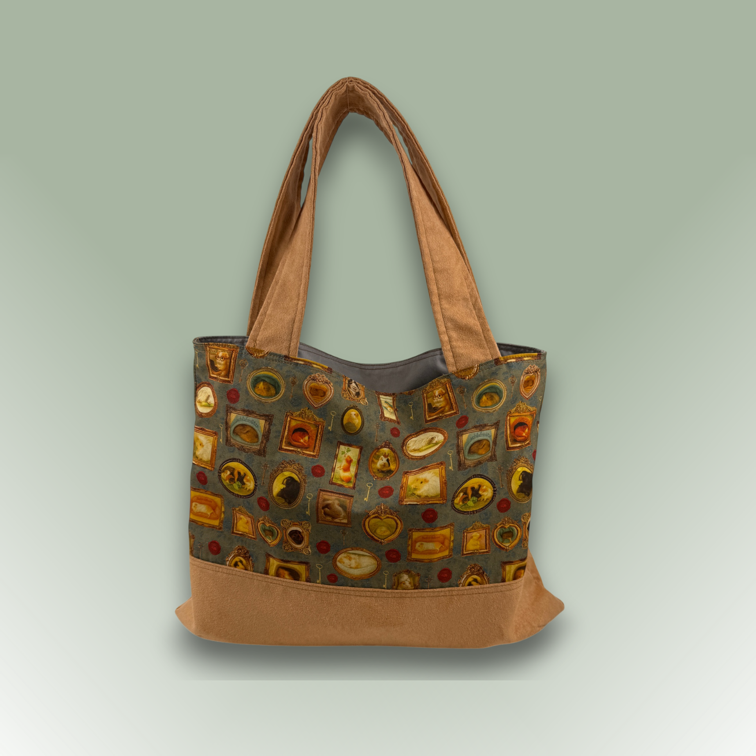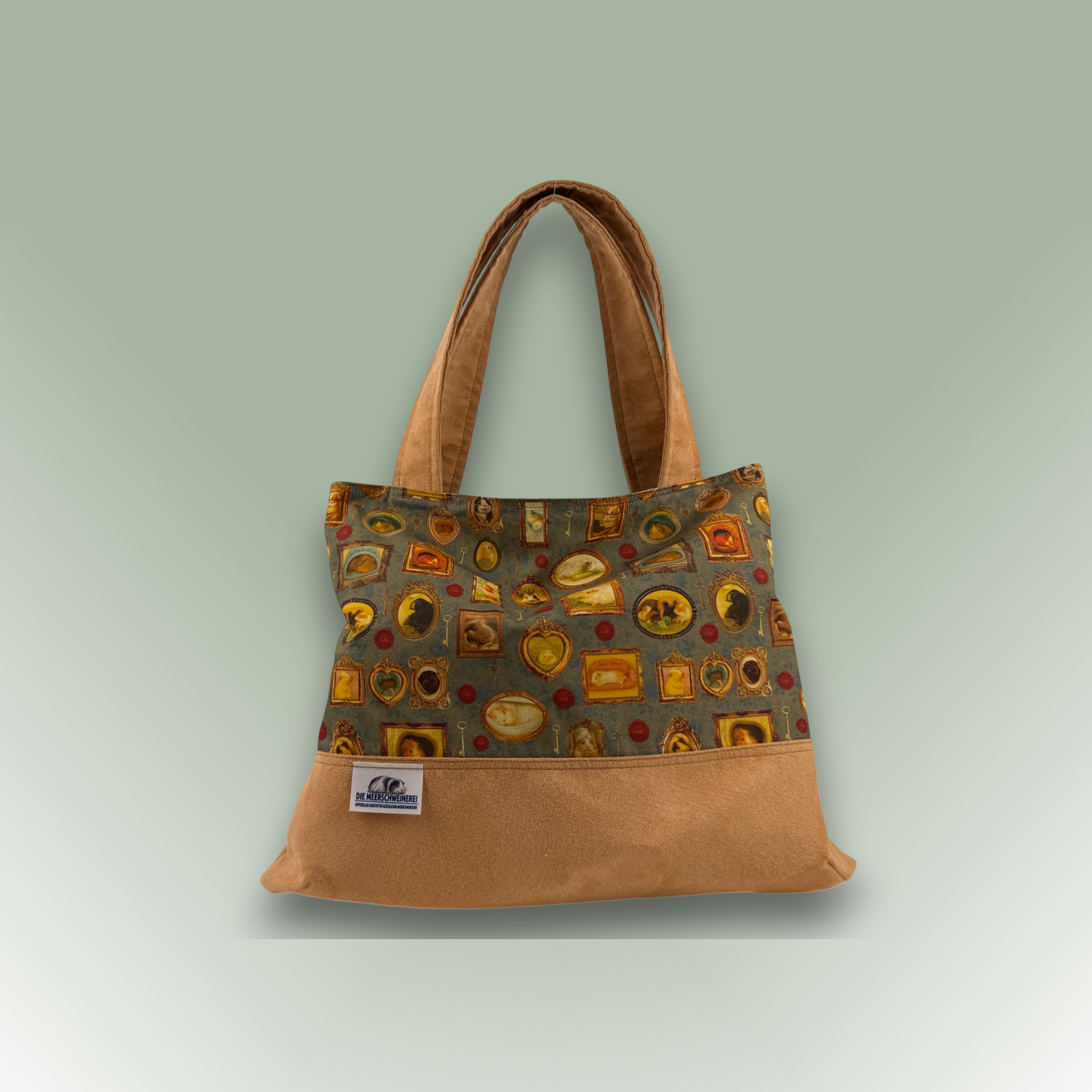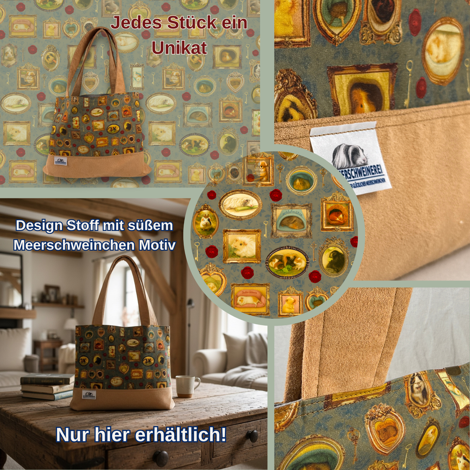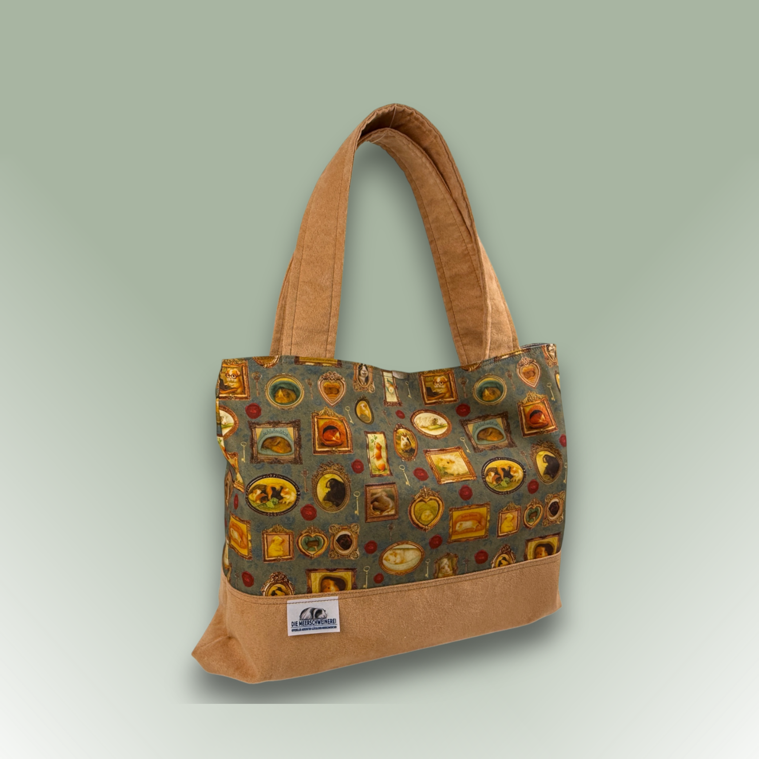 Das Motiv „Pippas Wohnzimmer“ zeigt kleine Meerschweinchen in nostalgischen Bilderrahmen – ein liebevolles Detail, das diese Tasche zu etwas ganz Besonderem macht.