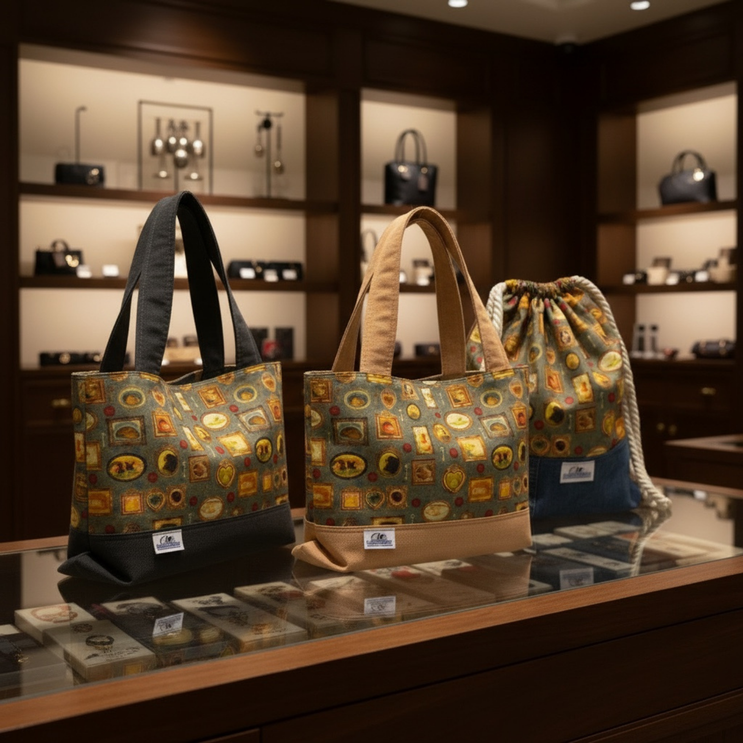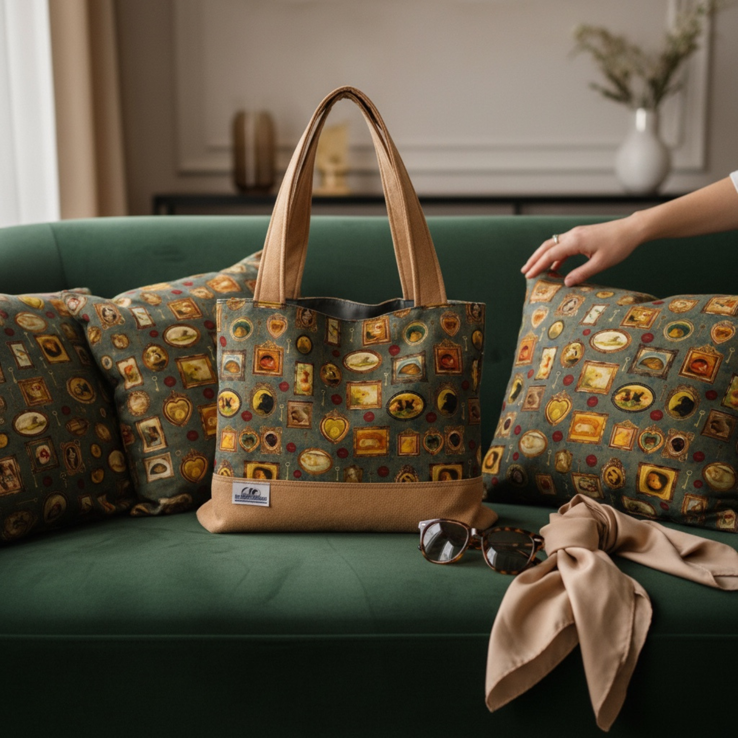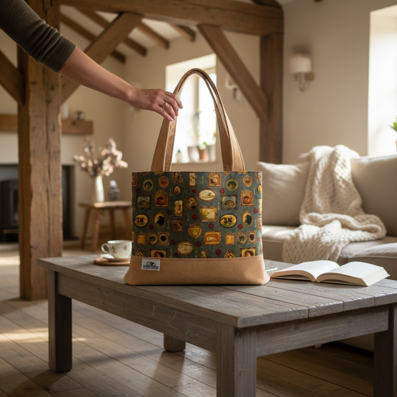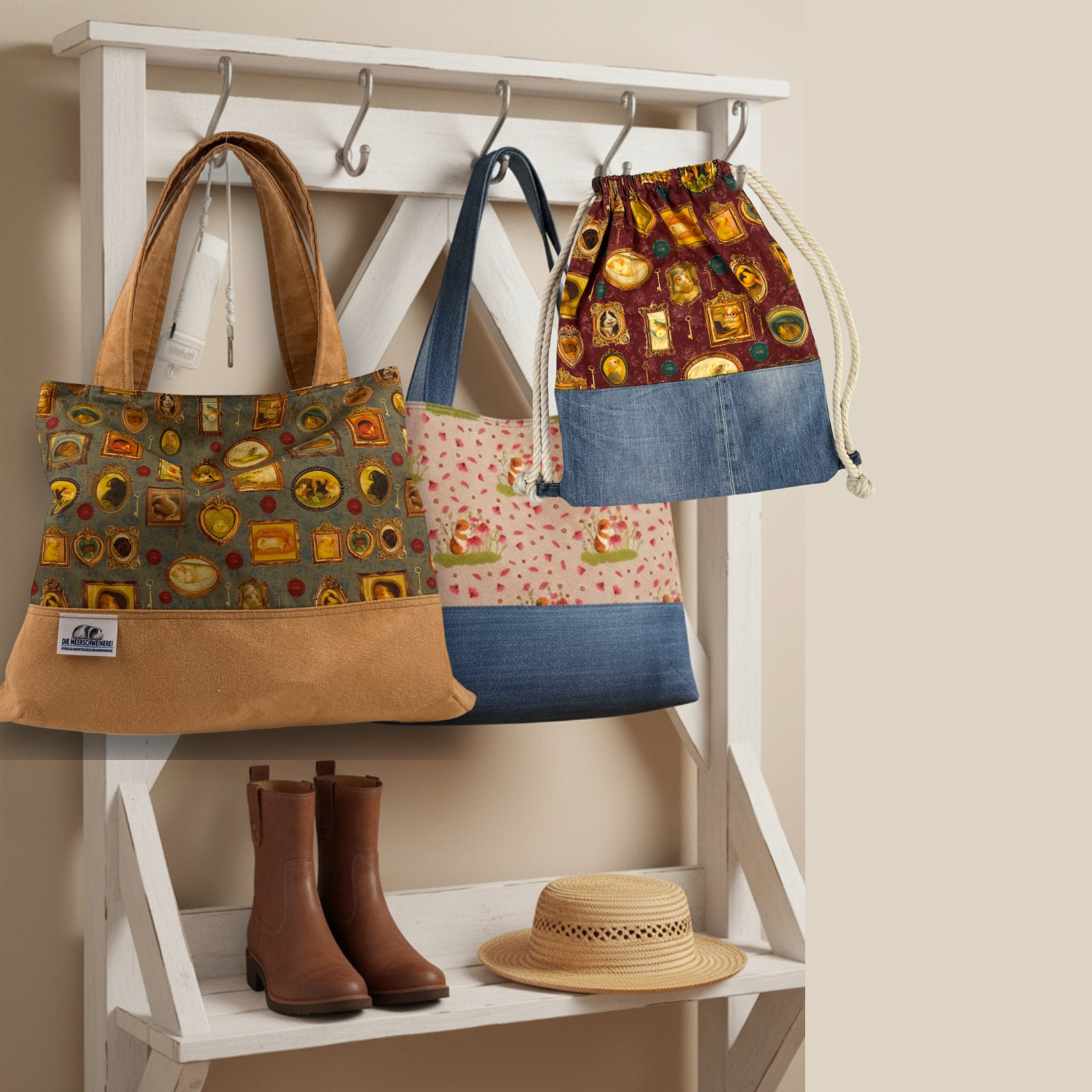 Das Motiv „Pippas Wohnzimmer“ zeigt kleine Meerschweinchen in nostalgischen Bilderrahmen – ein liebevolles Detail, das diese Tasche zu etwas ganz Besonderem macht.
