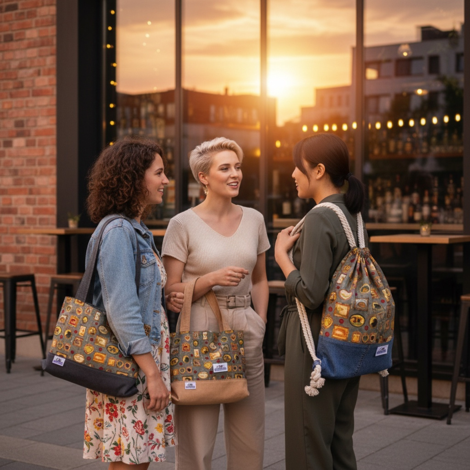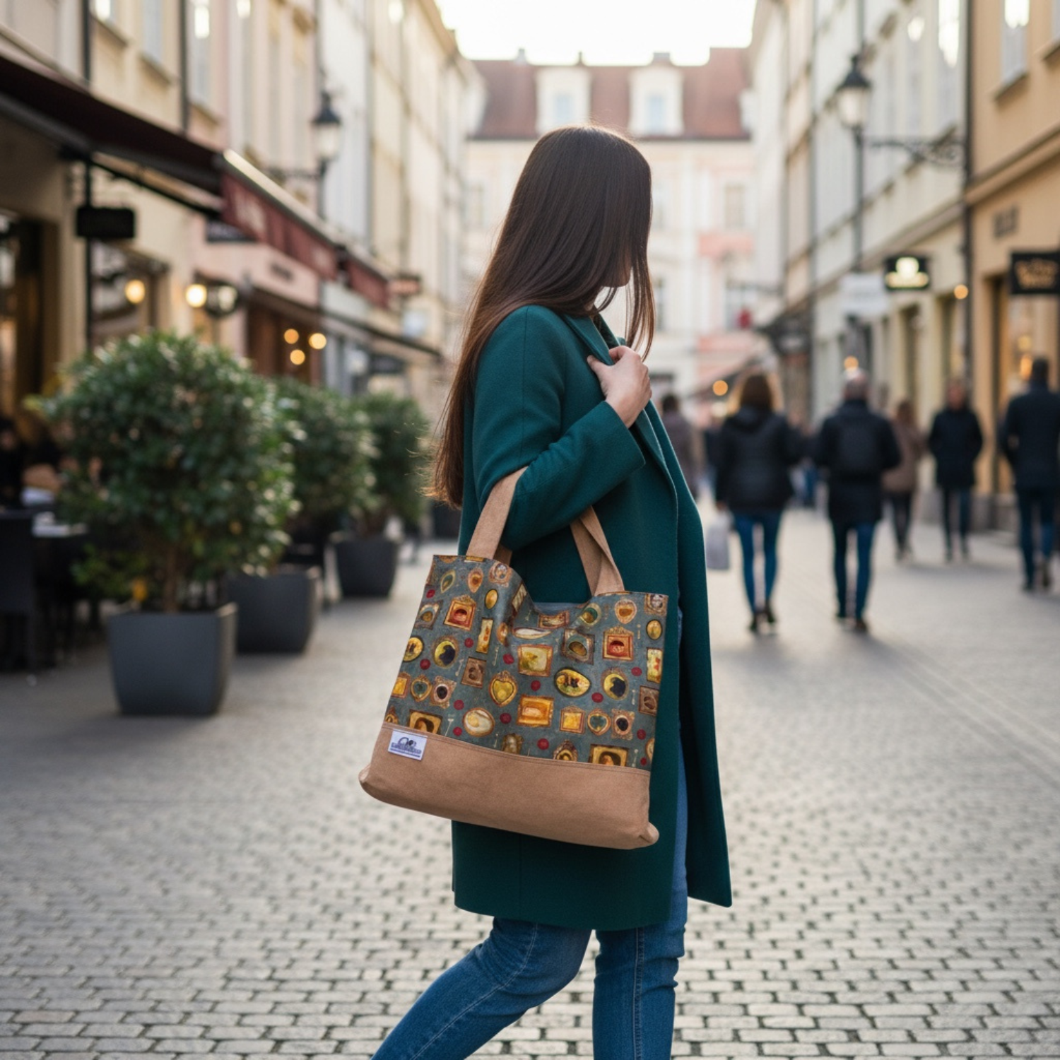 Kombiniert wird der Stoff mit dunkel beigem Wildlederimitat, das der Tasche eine warme, edle Optik verleiht und gleichzeitig besonders robust ist. So entsteht ein harmonisches Design, das sowohl im Alltag als auch beim Einkaufen oder unterwegs ein echter Hingucker ist.