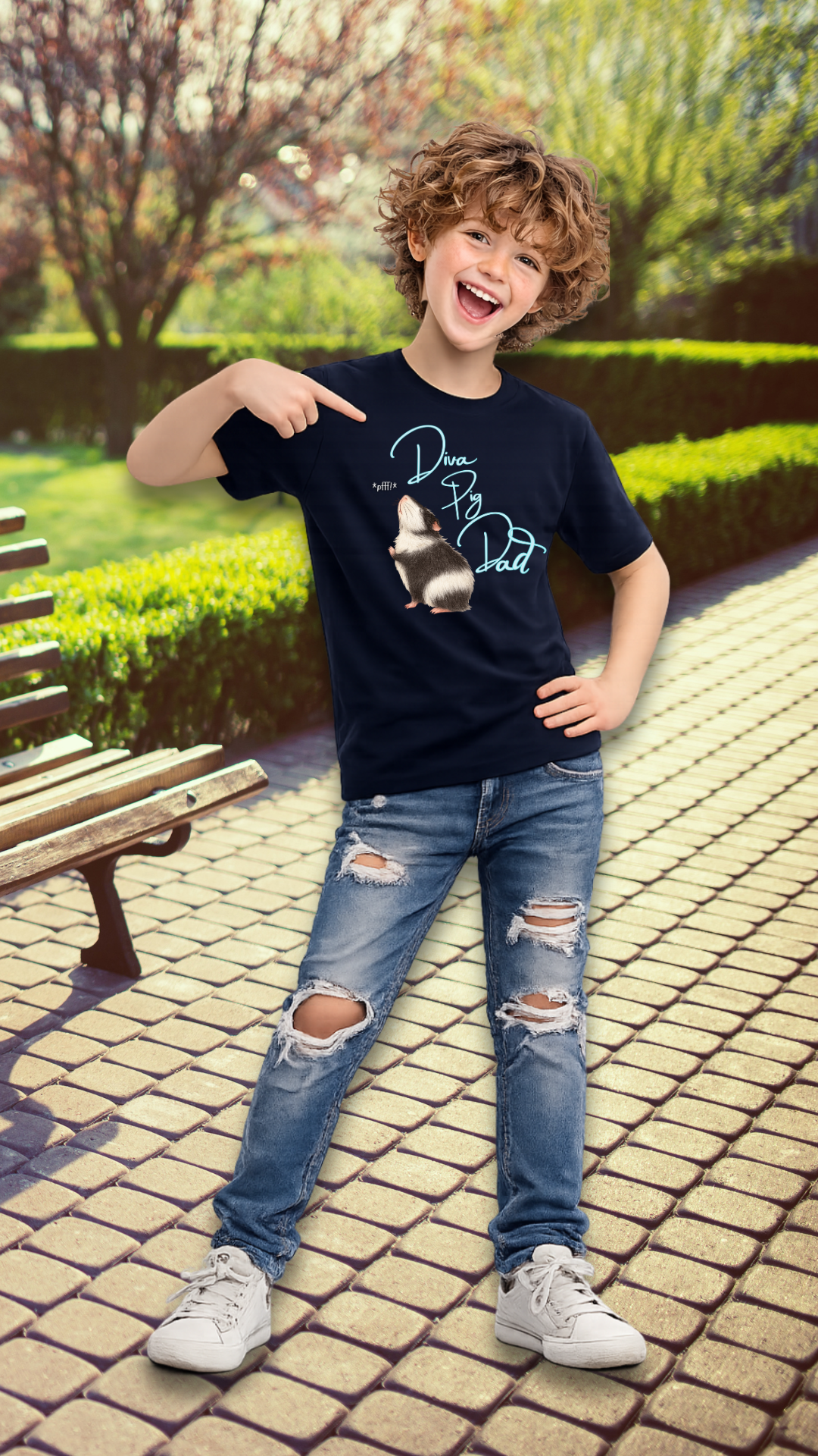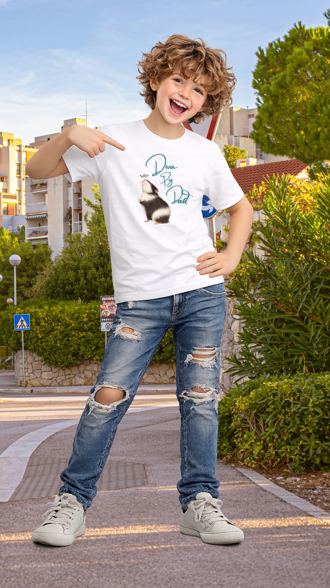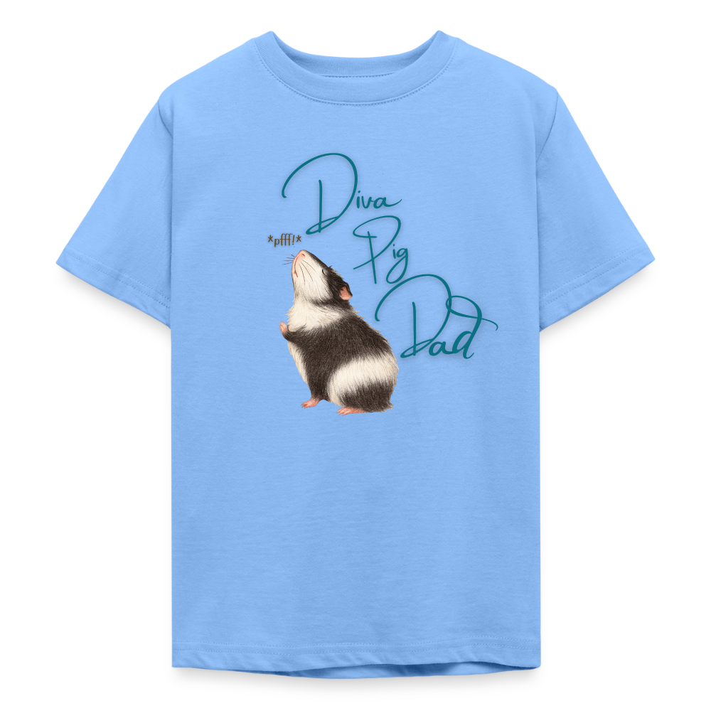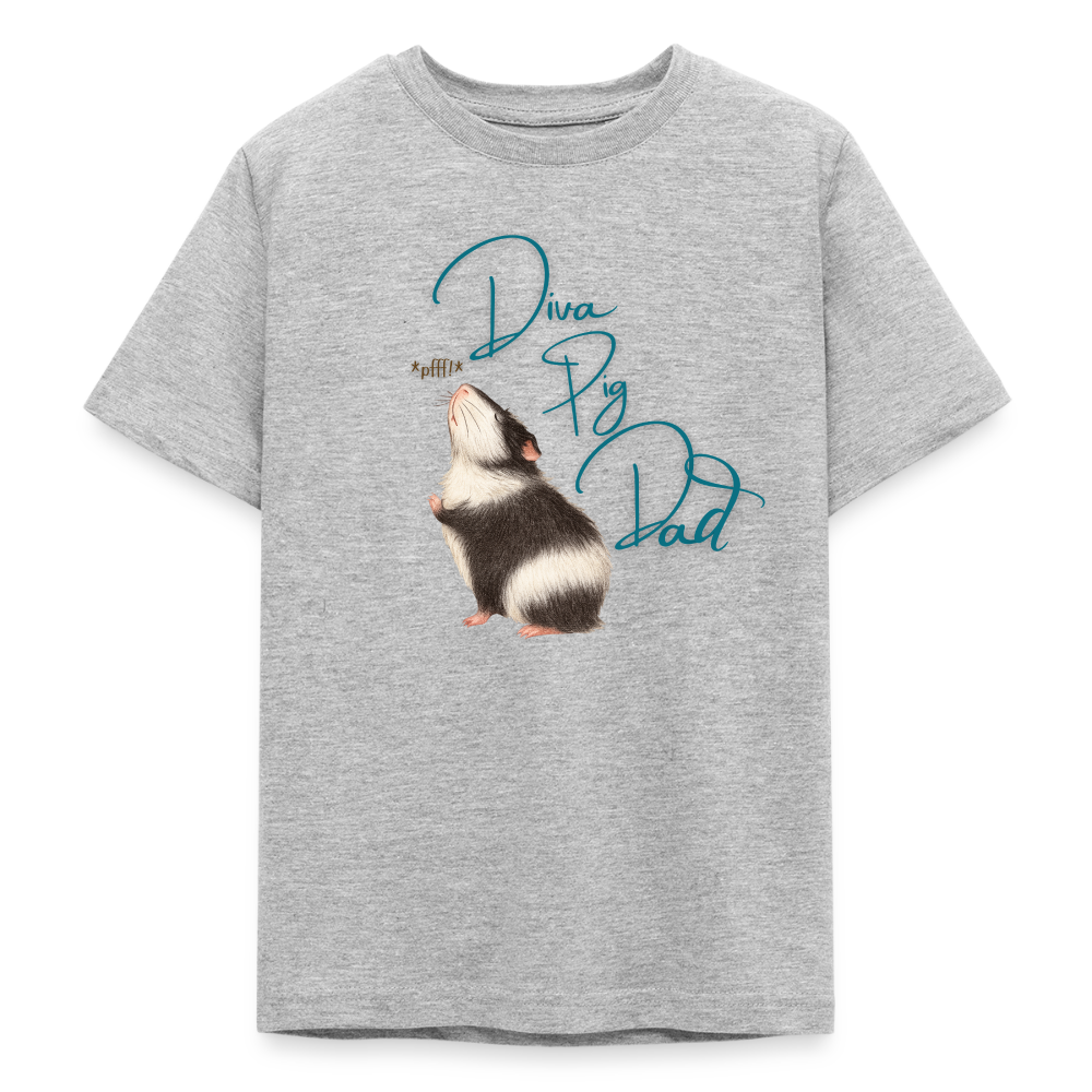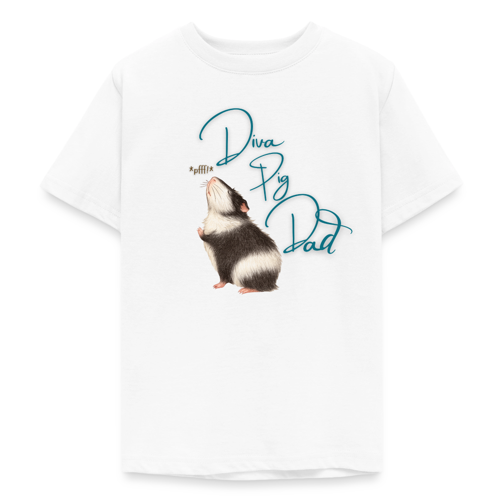 Teenager T-Shirt mit dem Meerschweinchen Motiv „Diva Pig Dad“. Frech, liebevoll und inspiriert von der wählerischen Seite verwöhnter Meerschweinchen. Ein Must Have für Meerli Papas.