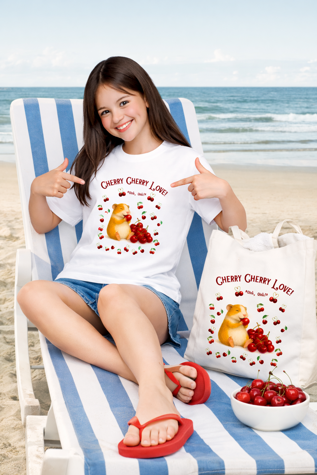 „Cherry Cherry Love!“ strahlt pure Fröhlichkeit aus. Das kleine Meerschweinchen sitzt zufrieden zwischen vielen roten Kirschen und genießt seinen süßen Moment sichtbar mit großer Freude. Herzförmige Details und der verspielte Schriftzug machen das Motiv besonders lebendig und charmant. Es wirkt sommerlich, süß und voller guter Laune – ein Motiv, das sofort ein Lächeln ins Gesicht zaubert.