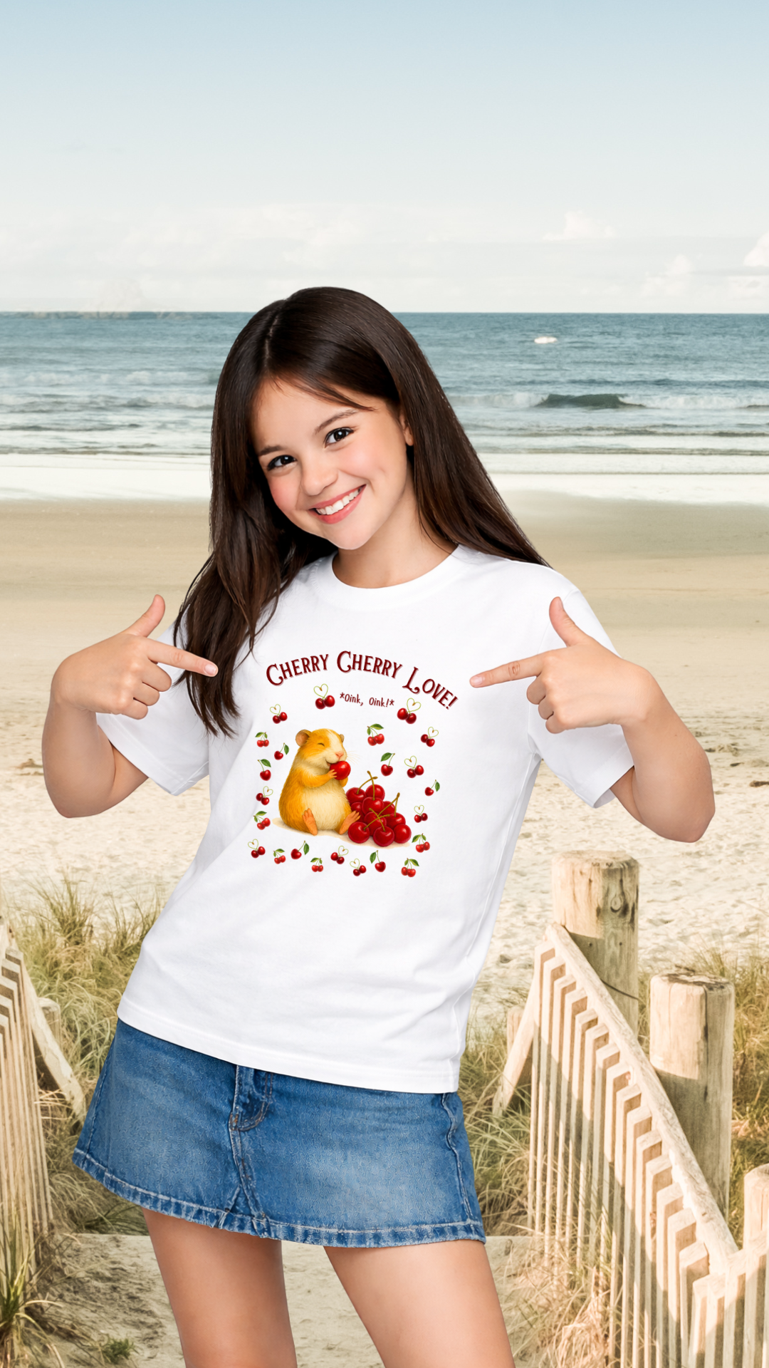 Das Teenager T-Shirt „Cherry Cherry Love!“ bringt Farbe, Freude und einen besonders niedlichen Meerli-Look in den Alltag. Das fröhliche Motiv mit dem glücklichen Meerschweinchen und den roten Kirschen macht dieses Shirt zu einem liebevollen Lieblingsstück für kleine Tierfreunde.