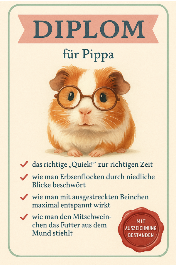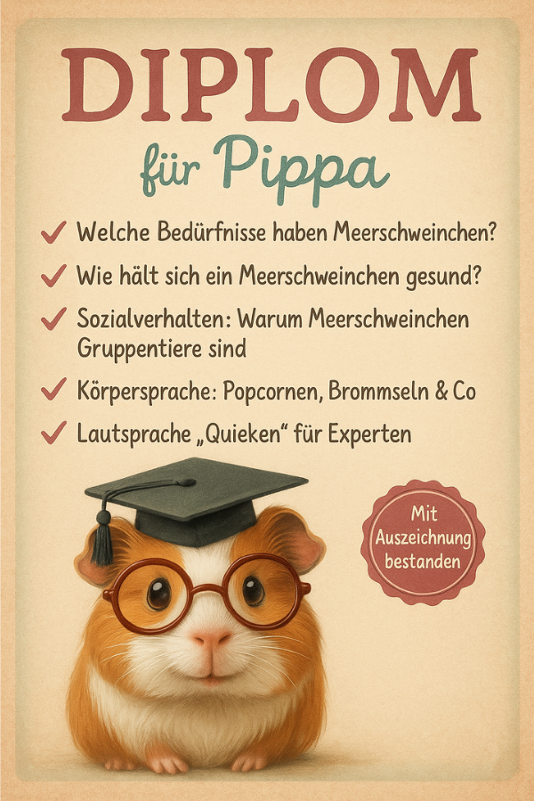 Der Weg zur offiziell geprüften Meerschweinchen Lehrmeisterin war kein Spaziergang durchs Heu. Pippa musste drei große Prüfungen bestehen – und dann war es geschafft! Die Prüfungen gelten als legendär.